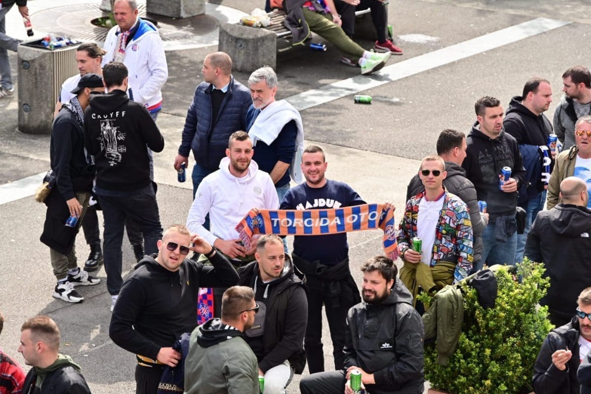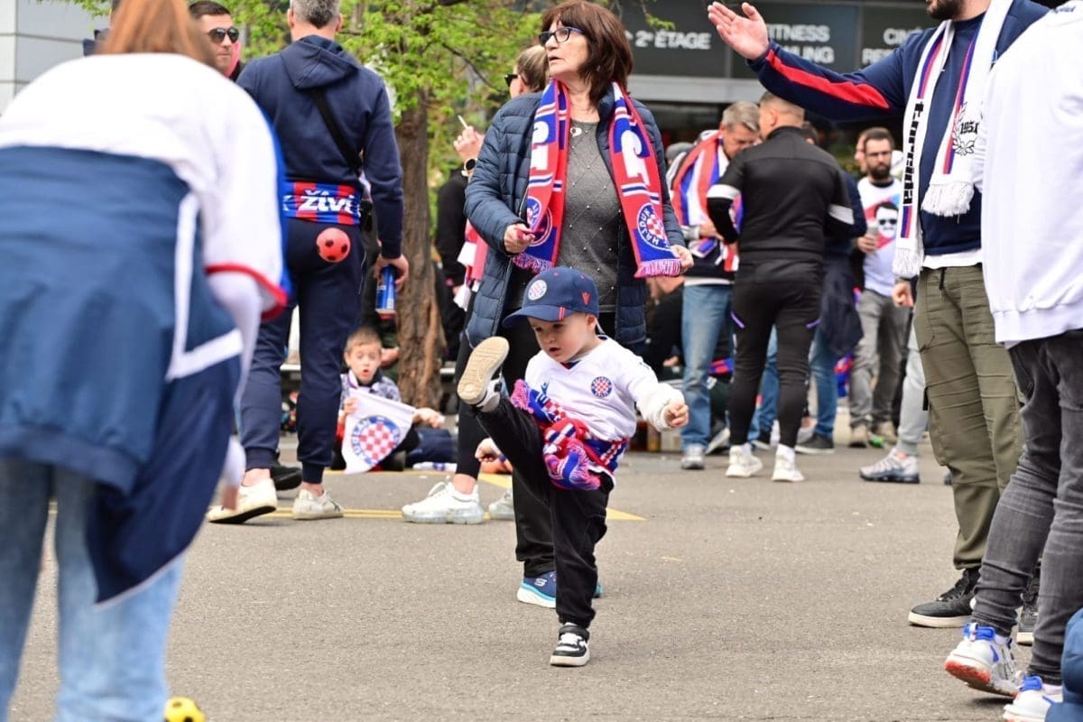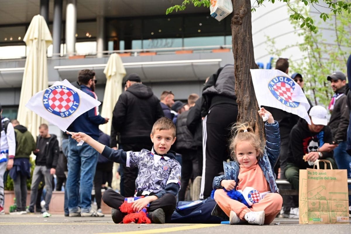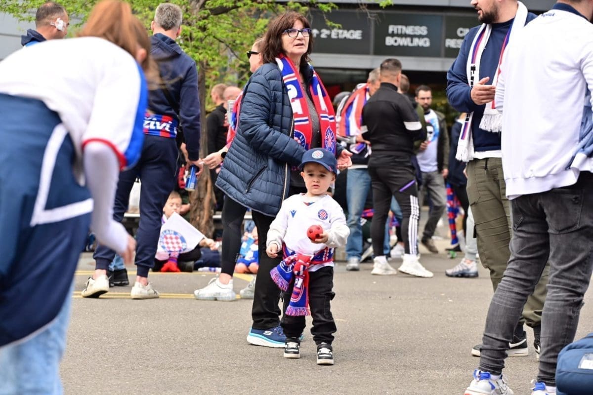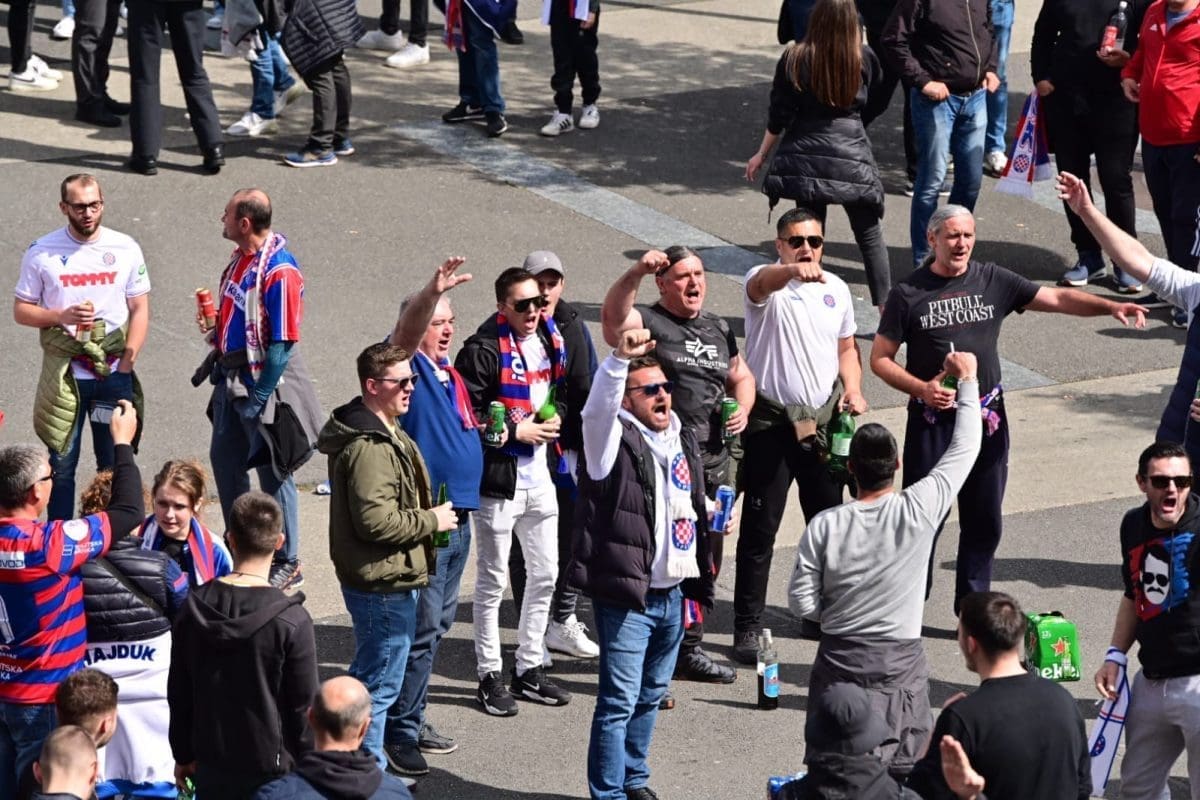 Vesela je atmosfera u Ženevi ispred stadiona. Kao da se igra na Poljudu, sve je puno navijača splitskog Hajduka. Pjevaju se pjesme, pale se baklje...