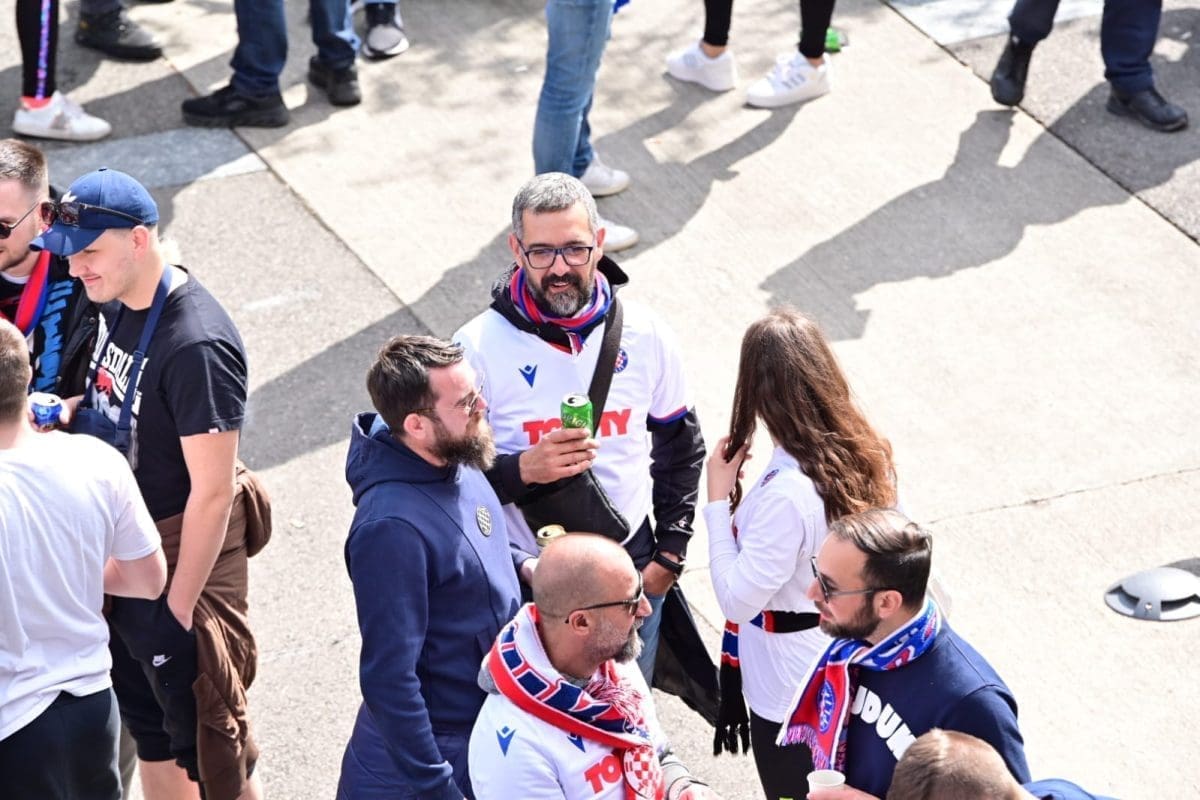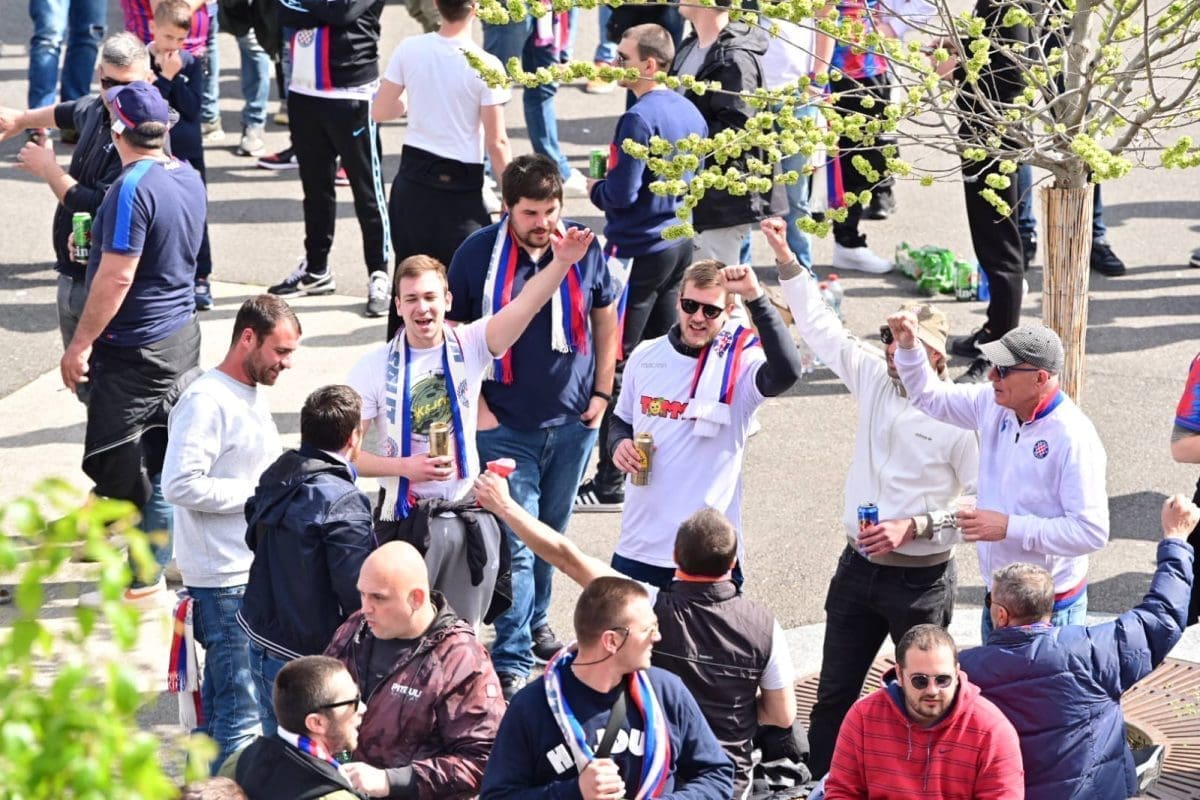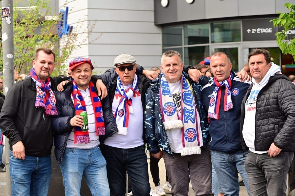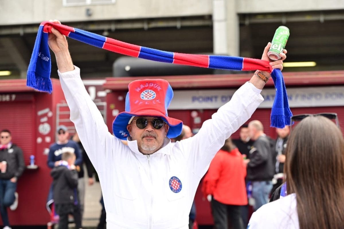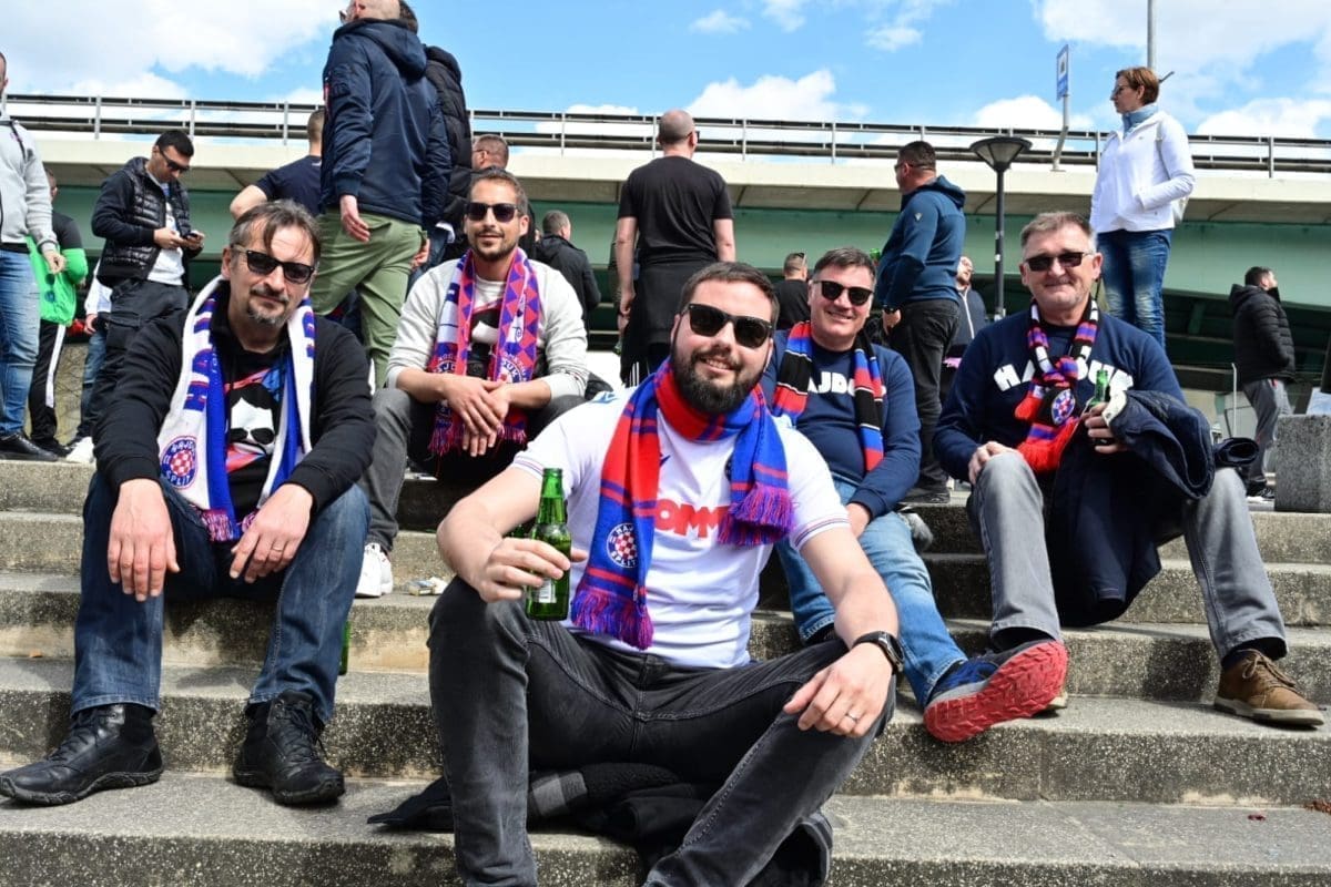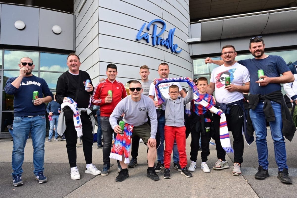 Vesela je atmosfera u Ženevi ispred stadiona. Kao da se igra na Poljudu, sve je puno navijača splitskog Hajduka. Pjevaju se pjesme, pale se baklje...