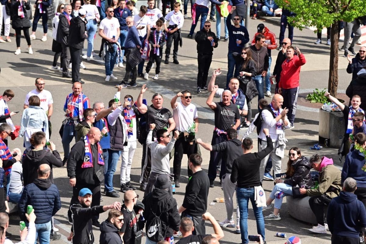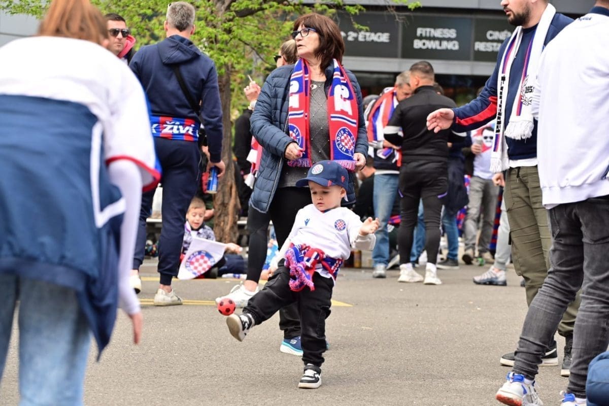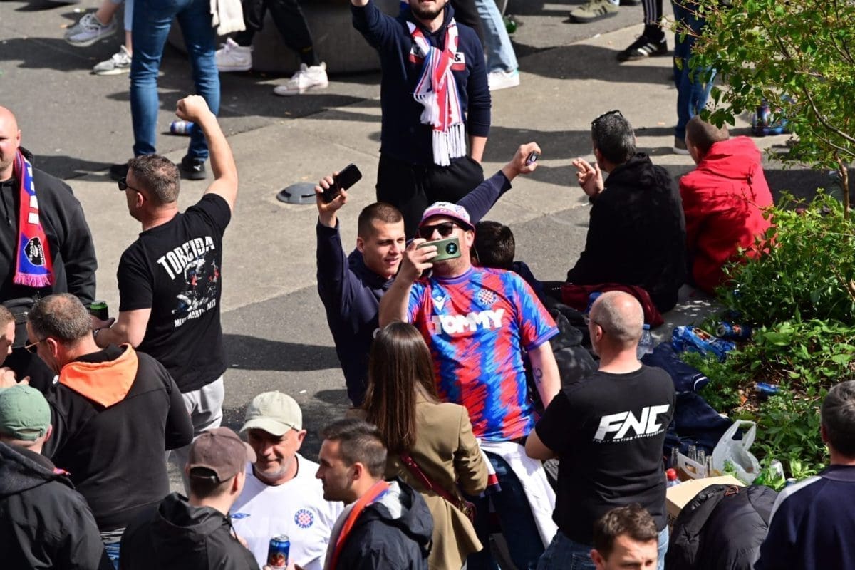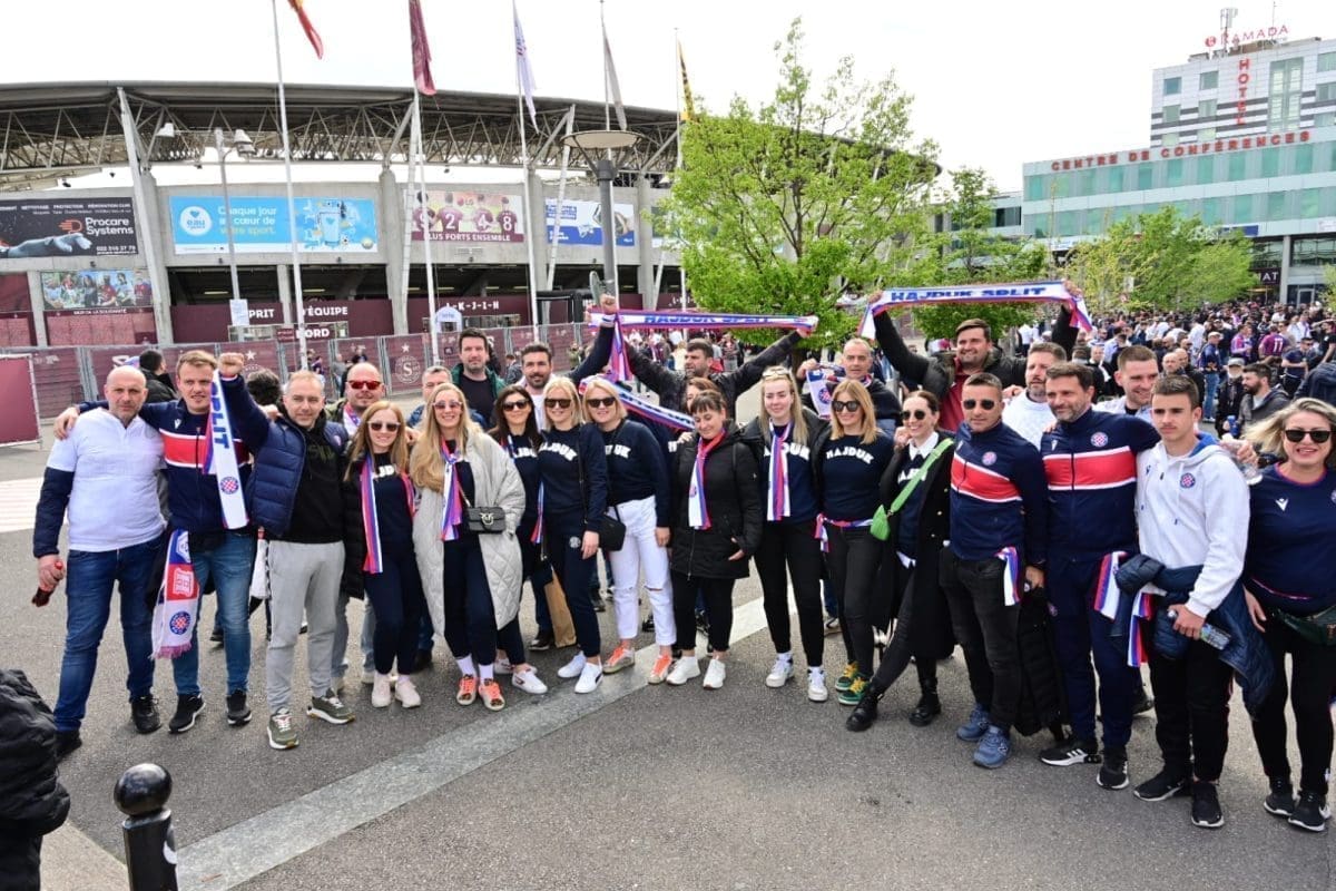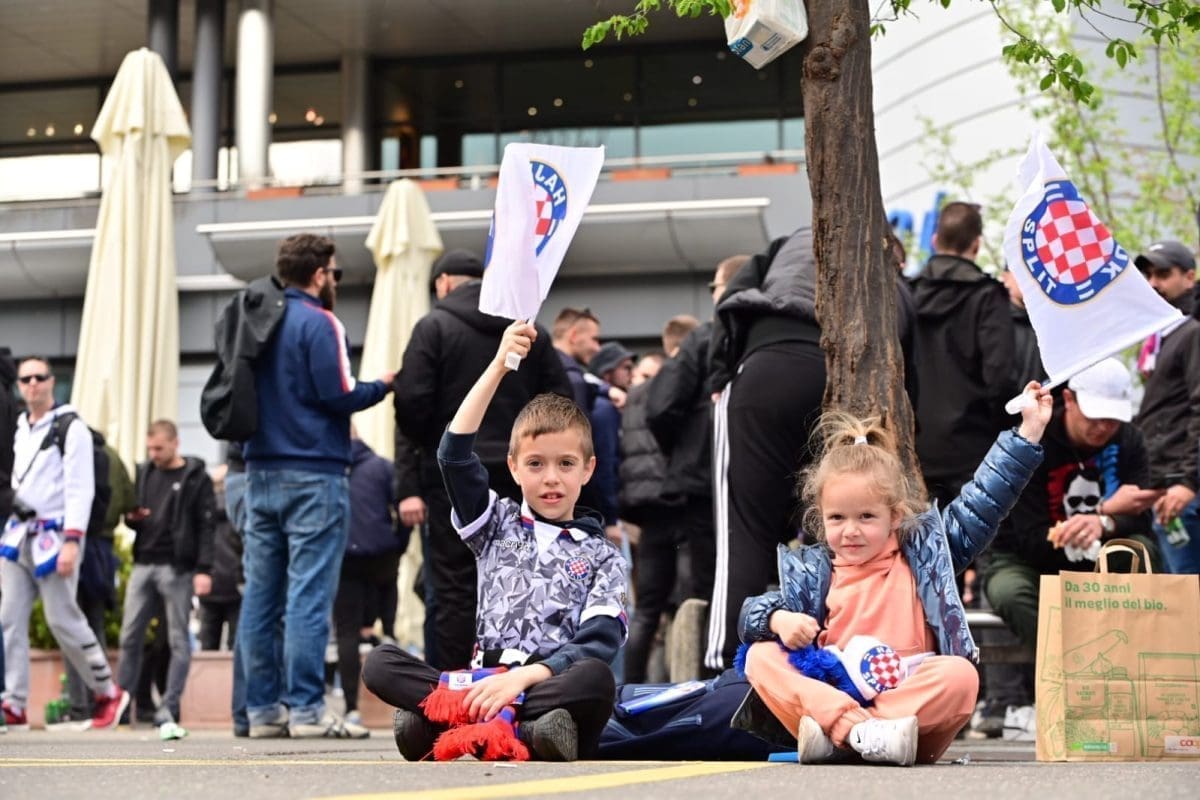 Vesela je atmosfera u Ženevi ispred stadiona. Kao da se igra na Poljudu, sve je puno navijača splitskog Hajduka. Pjevaju se pjesme, pale se baklje...