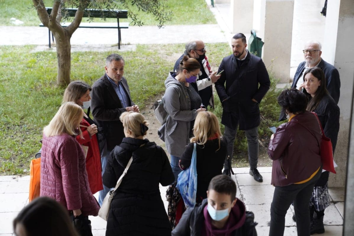 - Ne treba zvat policiju. Jednostavno ne možeš uć. Zvat ću redara Civilne zaštite - rekla je ravnateljica 1. gimnazije Dobrila Gotovac Stipaničev predsjedniku Skupštine Splitsko-dalmatinske županije i profesoru hrvatskog jezika Mati Šimundiću koji je pokušao nešto prije 14 sati doći do svog radnog mjesta. S njim je bilo još sedmero profesora gimnazije te jedan administrativni radnik.