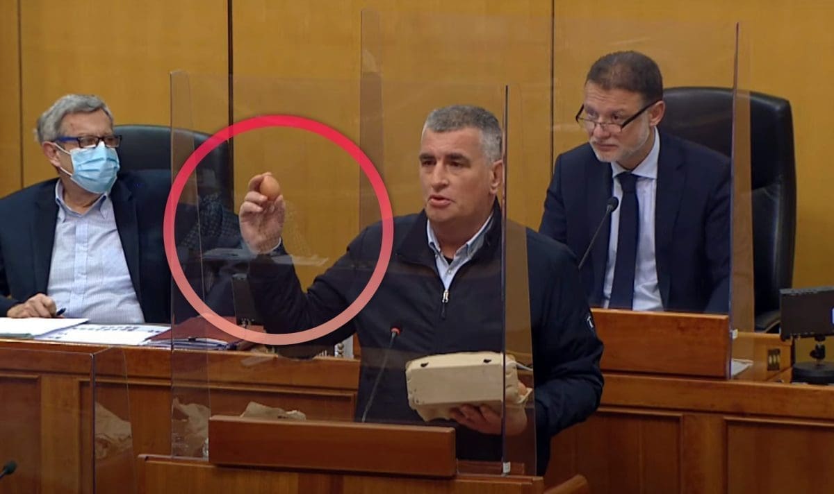 - Jaje niti je oružje niti ćemo bilo kome prijetiti. Znam da premijer dolazi na Odbor za nacionalnu sigurnost zbog čovjeka kojeg su priveli zbog jaja, ali nije riječ o terorizmu tako da ne morate, predsjedniče, zvati stražu - poručio je Bulj predsjedniku Sabora Gordanu Jandrokoviću, koji je za saborsku govornicu donio kutiju jaja.