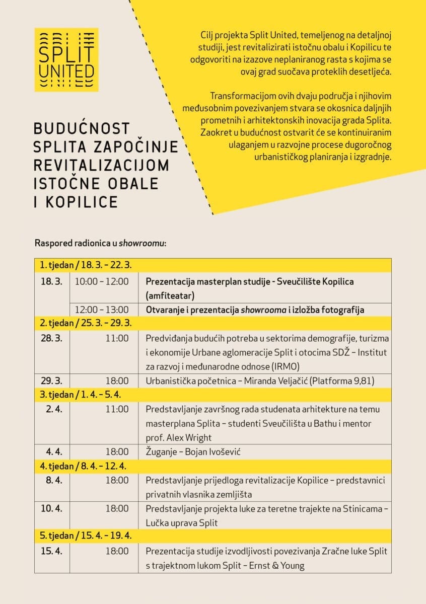 Showroom projekta Split United, odnosno izrade masterplan studije urbane revitalizacije Istočne obale i Kopilice, otvara se za svu zainteresiranu javnost danas u 16 sati. Showroom je smješten na prvom katu Upravne zgrade Dalme pokraj Sveučilišnog centra za stručne studij te će biti otvoren sve do 19. travnja radnim danom od 16 do 20 sati. U njemu su izloženi vizualni prikazi nacrta masterplana kao i vremenske crte razvoja Istočne obale i Kopilice, kako bi se svi zainteresirani mogli detaljnije informirati o predstavljenoj studiji te aktivno i informirano uključiti u javnu raspravu. U showroomu je iz istog razloga protekla tri dana održan i niz stručnih radionica sa različitim dioničkim skupinama, od gradskih vijećnika i struke do vlasnika zemljišta na dvije predmetne lokacije i samih stanovnika.