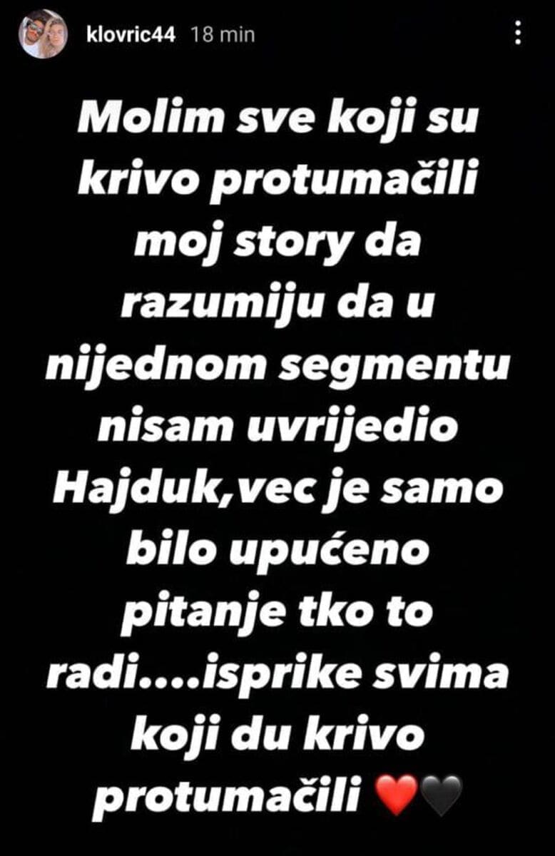 Nakon kratkog vremena Lovrić je shvatio da mu to nije najbolji potez i obrisao je story, a onda se ispričao Hajduku i njegovim navijačima.