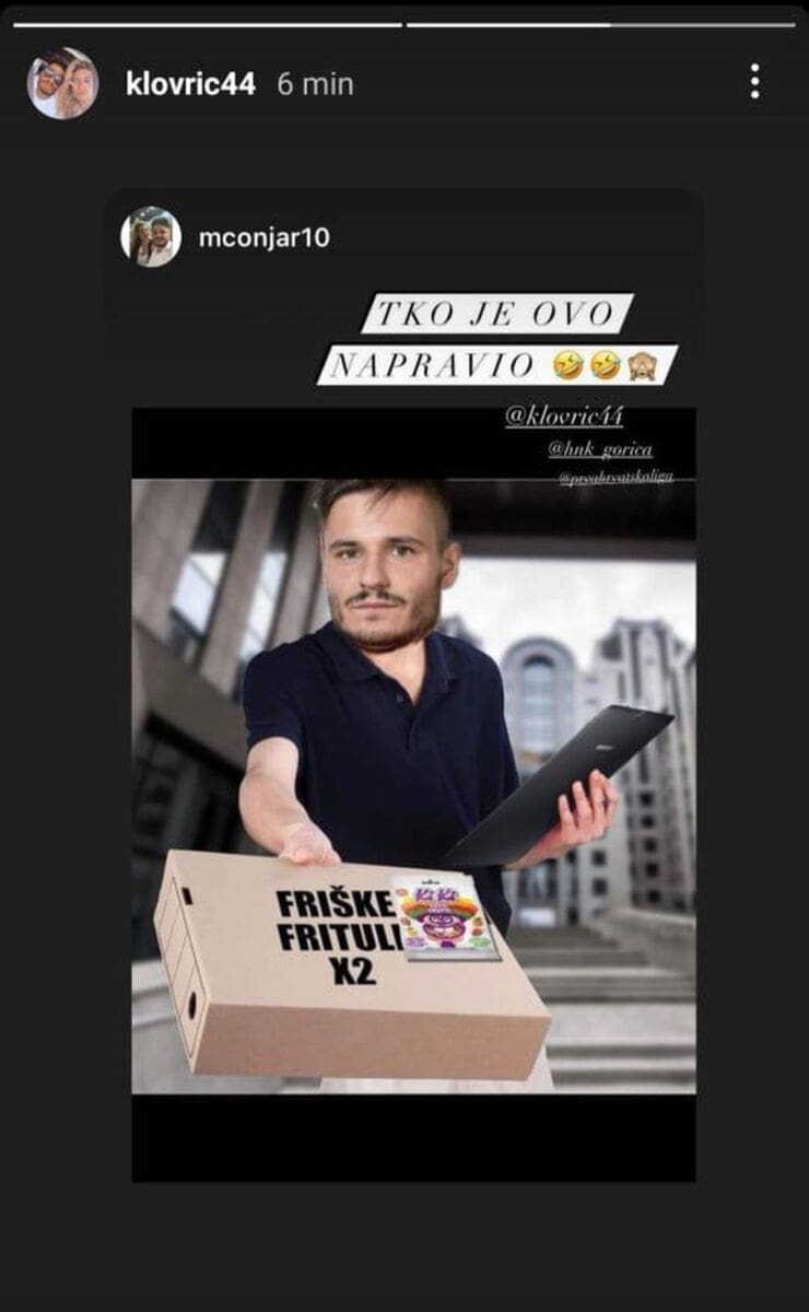 Lovrićeva zaručnica Monika, bivša nogometašica Splita, na Instagramu je objavila montažu Lovrića kao dostavljača fritula hajdukovcima i zapitala se: ''Tko je ovo napravio?'', a najbolji nogometaš Gorice je fotografiju također podijelio na svom storyju.