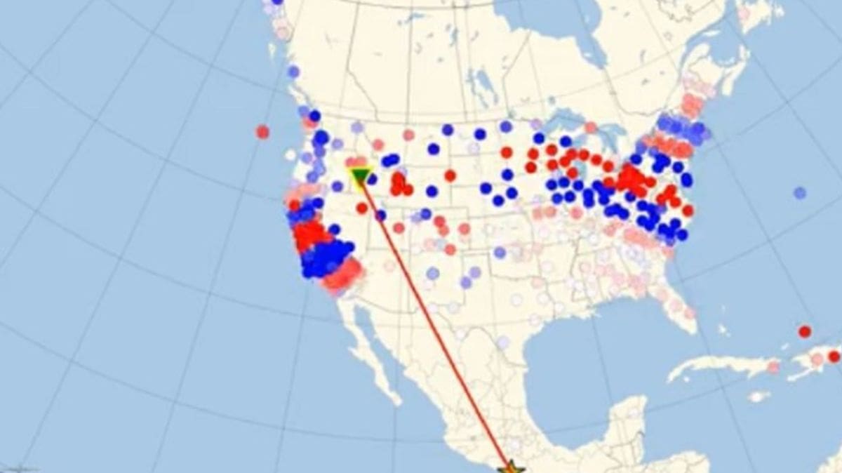 Animacija prikazuje širenje potresa Sjevernom Amerikom.