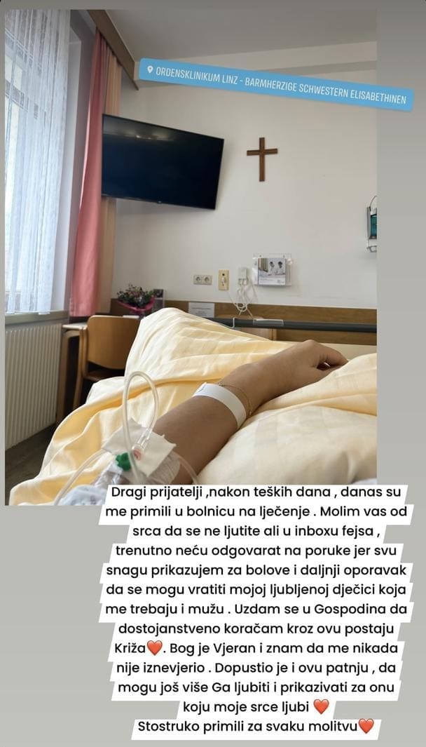- Dragi prijatelji, nakon teških dana, danas su me primili u bolnicu na liječenje. Molim vas od srca da se ne ljutite ali u inbox fejsa, trenutno neću odgovarati na poruke jer svu snagu prikazujem za bolove i daljnji oporavak da se mogu vratiti mojoj ljubljenoj dječici koja me trebaju i mužu. Uzdam se u Gospodina da dostojanstveno koračam kroz ovu postaju Križa. Bog je vjeran i znam da me nikada nije iznevjerio. Dopustio je i ovu patnju, da mogu još više ga ljubiti i prikazivati za onu koju moje srce ljubi. - napisala je Simona i objavila fotografiju iz bolničke sobe.