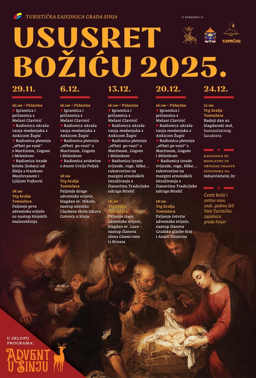 Sinj od subote, 29. studenoga, postaje središte adventske čarolije. Advent započinje paljenjem prve adventske svijeće na sinjskoj Pijaci u 18 sati, uz nastup Sinjskih mažoretkinja i bogat kulturni program. Prije toga, u Palacini počinju kreativne božićne radionice za djecu i odrasle.