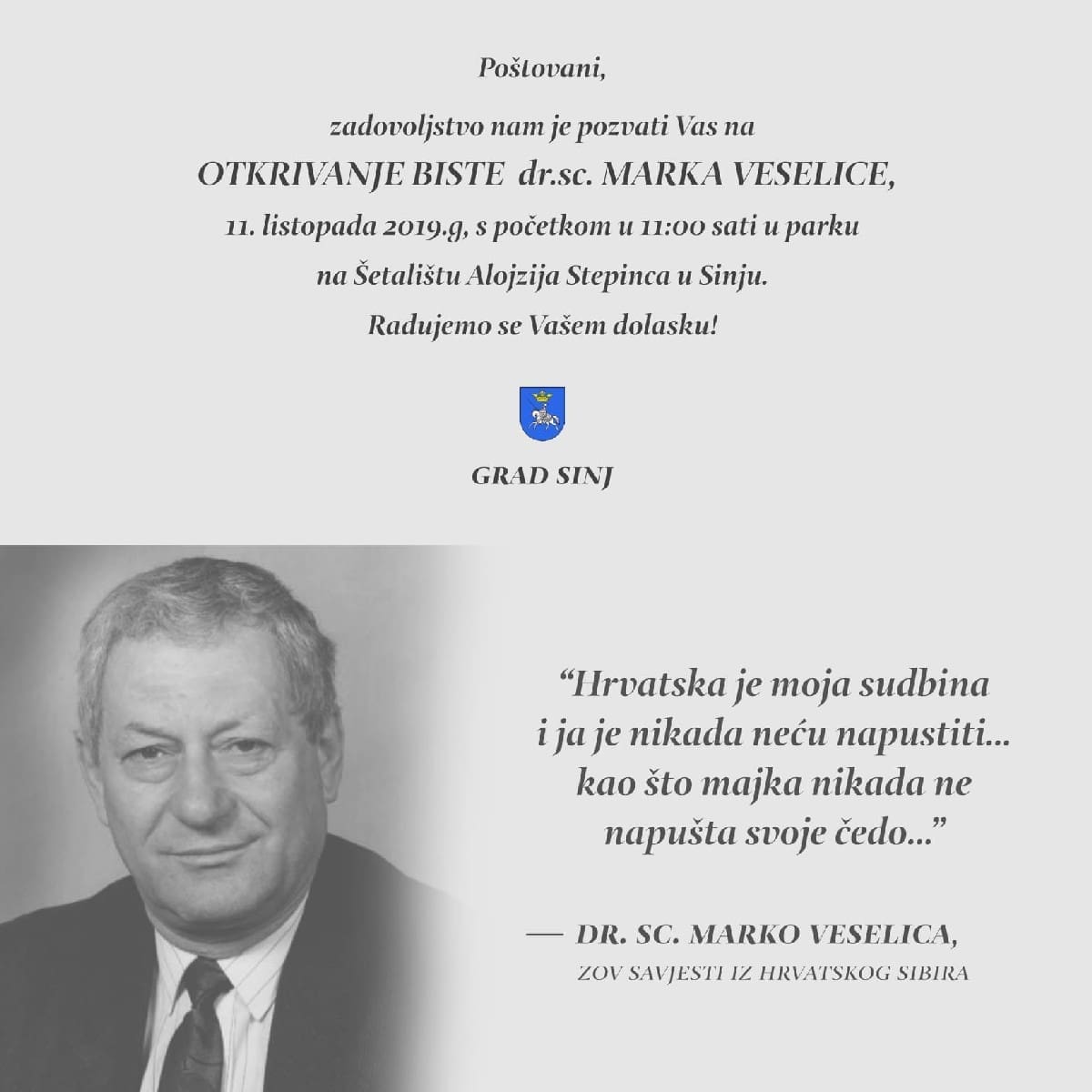 Uz nazočnost obitelji Marka Veselice o ovom će istaknutom Sinjaninu, hrvatskom rodoljubu i intelektualcu, govoriti fra Mirko Marić, politolog Jakov Žižić, profesor Velimir Borković i profesor Marko Duvnjak.