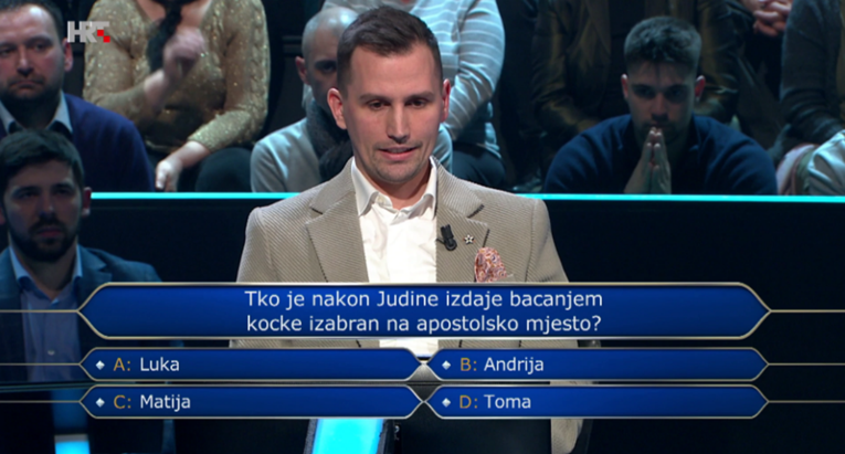 Nakon sjajne igre zapeo na 8. pitanju u kojem se tražio apostol izabran bacanjem kocke nakon Judine izdaje.