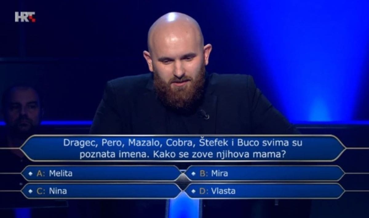 "Dragec, Pero, Mazalo, Cobra, Štefek i Buco - svima su poznata imena. Kako se zove njihova mama?" glasilo je pitanje. Ponuđeni odgovori bili su Melita, Mira, Nina i Vlasta, a Igor je zatražio džokera te je pozvao kolegicu s posla, budući da nije znao ime mame Vragec.