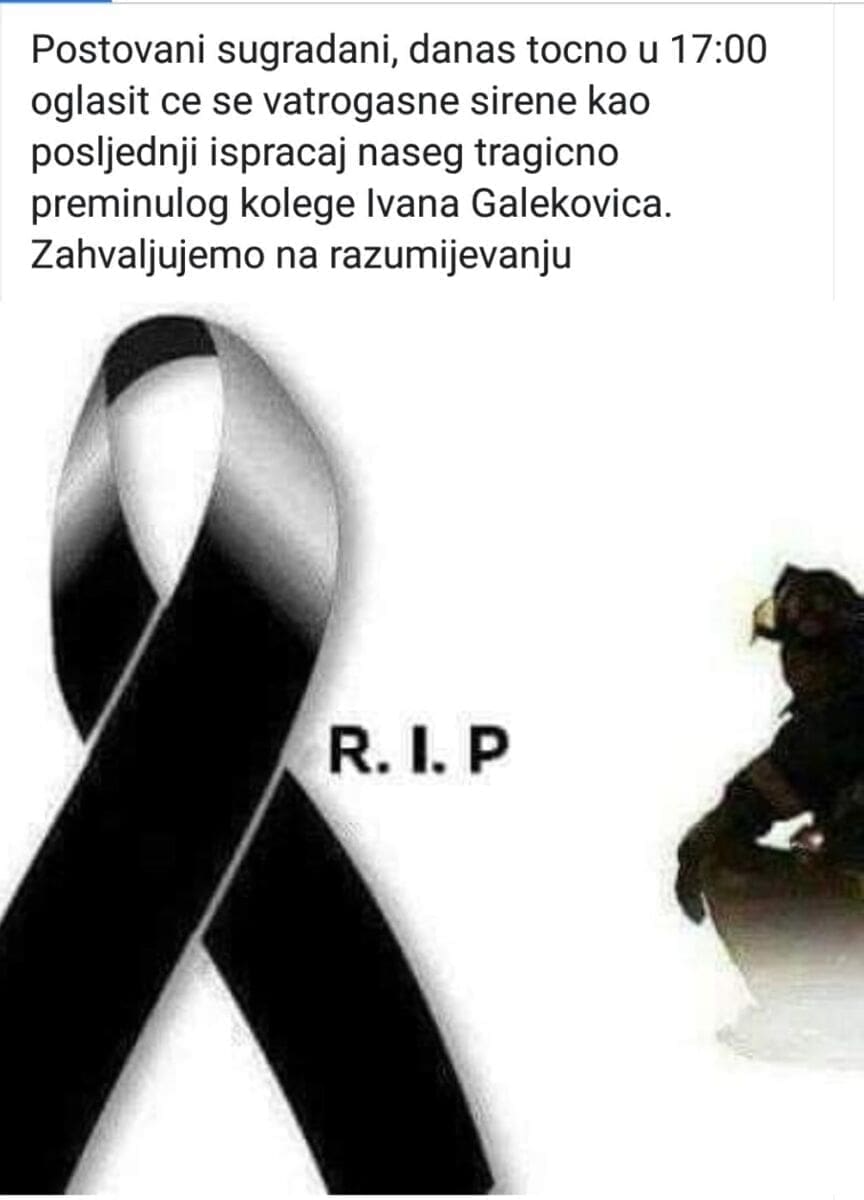 "Pozivam sve kolegice i kolege da u utorak u 17 sati ispred svojih vatrogasnih domova, dislokacija, parkinga… na jednu minutu upale rotacije i sirene na svojim vozilima i tako odaju posljednju počast našem kolegi, bratu po vatri Ivanu Galekoviću" - glasio je jučerašnji poziv.