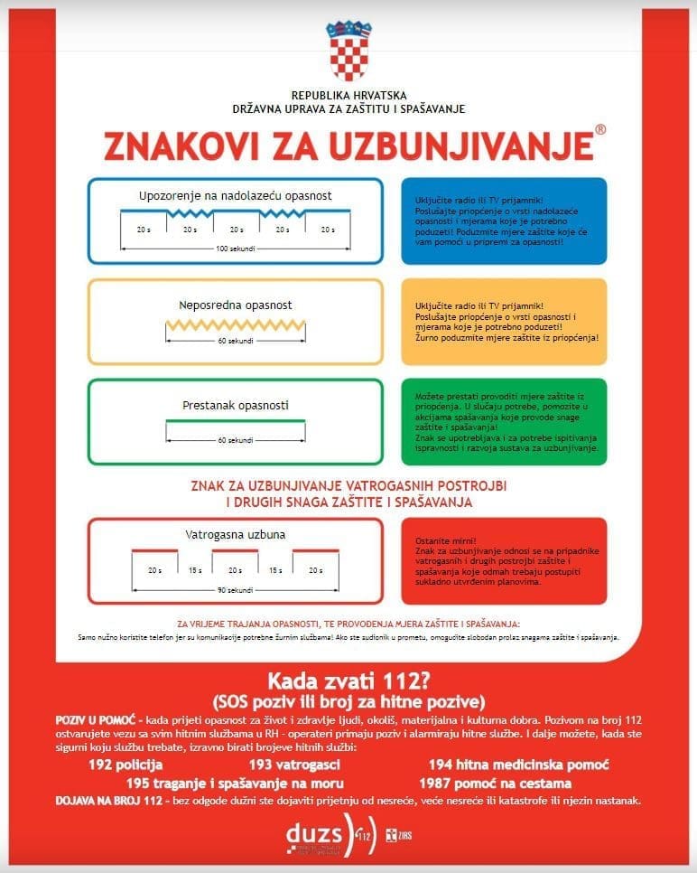 Po većim zgradama su postavljene obavijesti o trajanjima zvučnih obavijesti, ali često kraj njih prođemo bez da ih i pogledamo pa evo fotografija za prisjetiti se. Ton bez oscilacija i prekida je znak za prestanak opasnosti, ali i zvuk koji se koristi za testiranje sirena za uzbune.