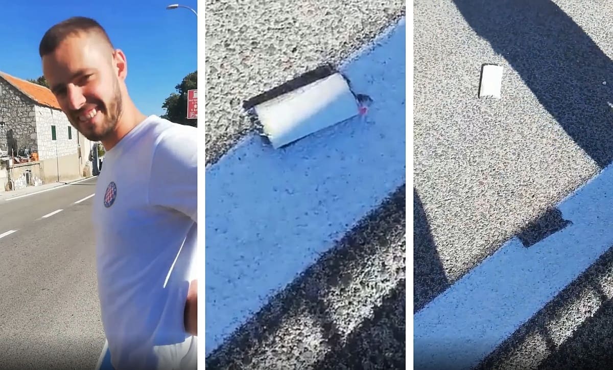 Video koji prenosi Radio Dalmacija na svom Instagramu, prikazuje stanovnika koji je primijetio i zabilježio čudan predmet na cesti. Predmet, očito karton, ukomponiran je u bijelu traku i zalijepljen za cestu.