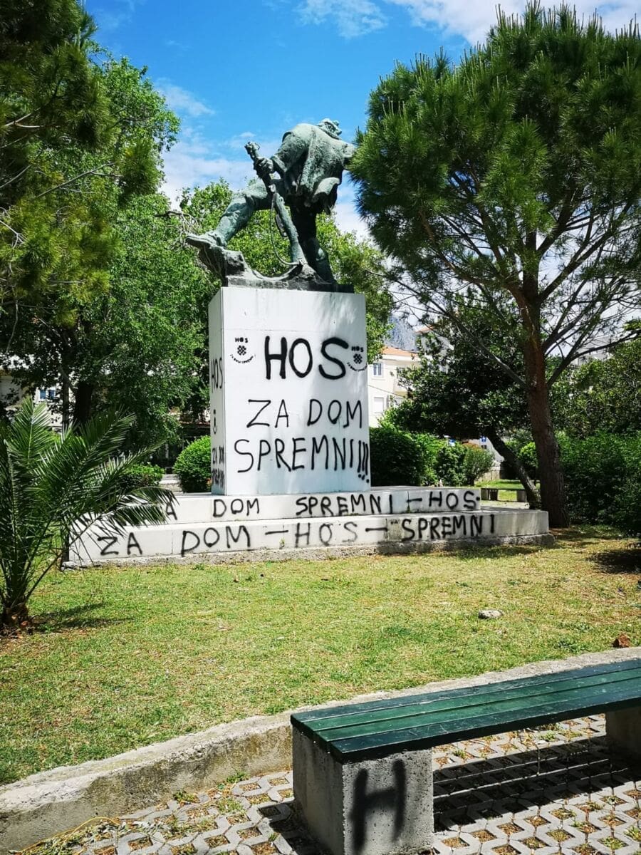 Ovog puta "stradao" je spomenik palim borcima NOB-a, koji se nalazi između Jadranske magistrale i mora. Na spomeniku su nacrtani grbovi HOS-a, uz pozdrav "Za dom spremni".