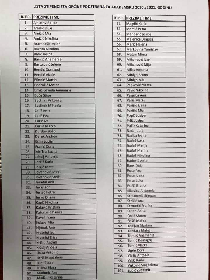 Temeljem provedenog Natječaja pravo na stipendiju ostvario je 101 student iz Podstrane. Dodijelit će se 32 stipendije u iznosu od 800 kn, a 69 stipendija u iznosu od 500 kn mjesečno.