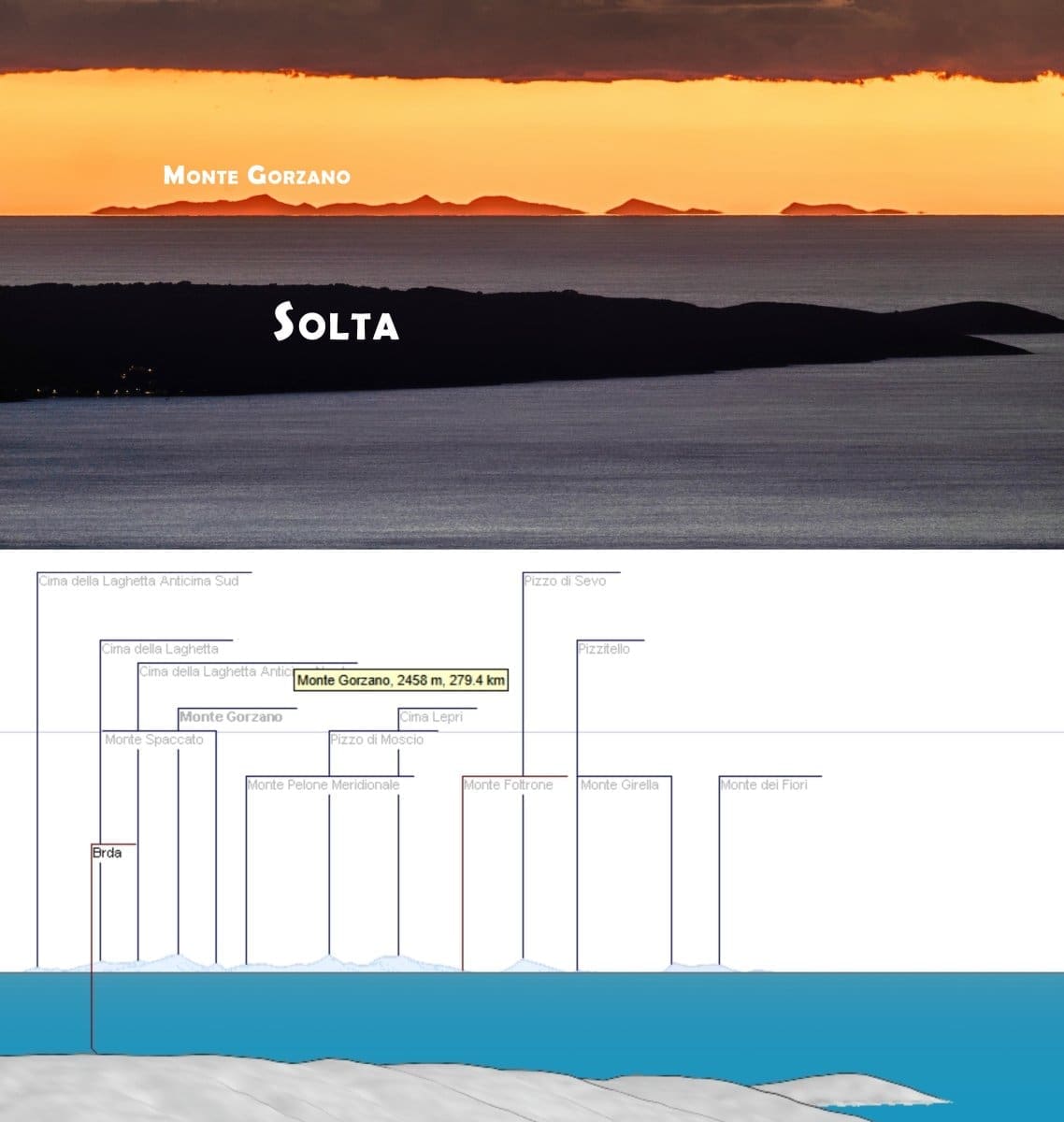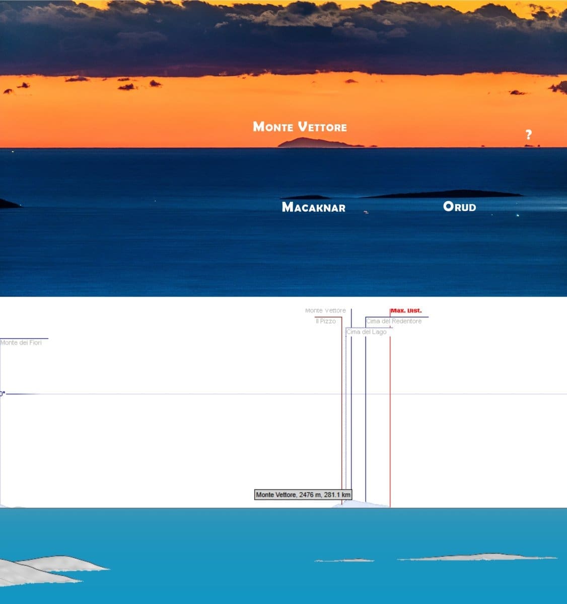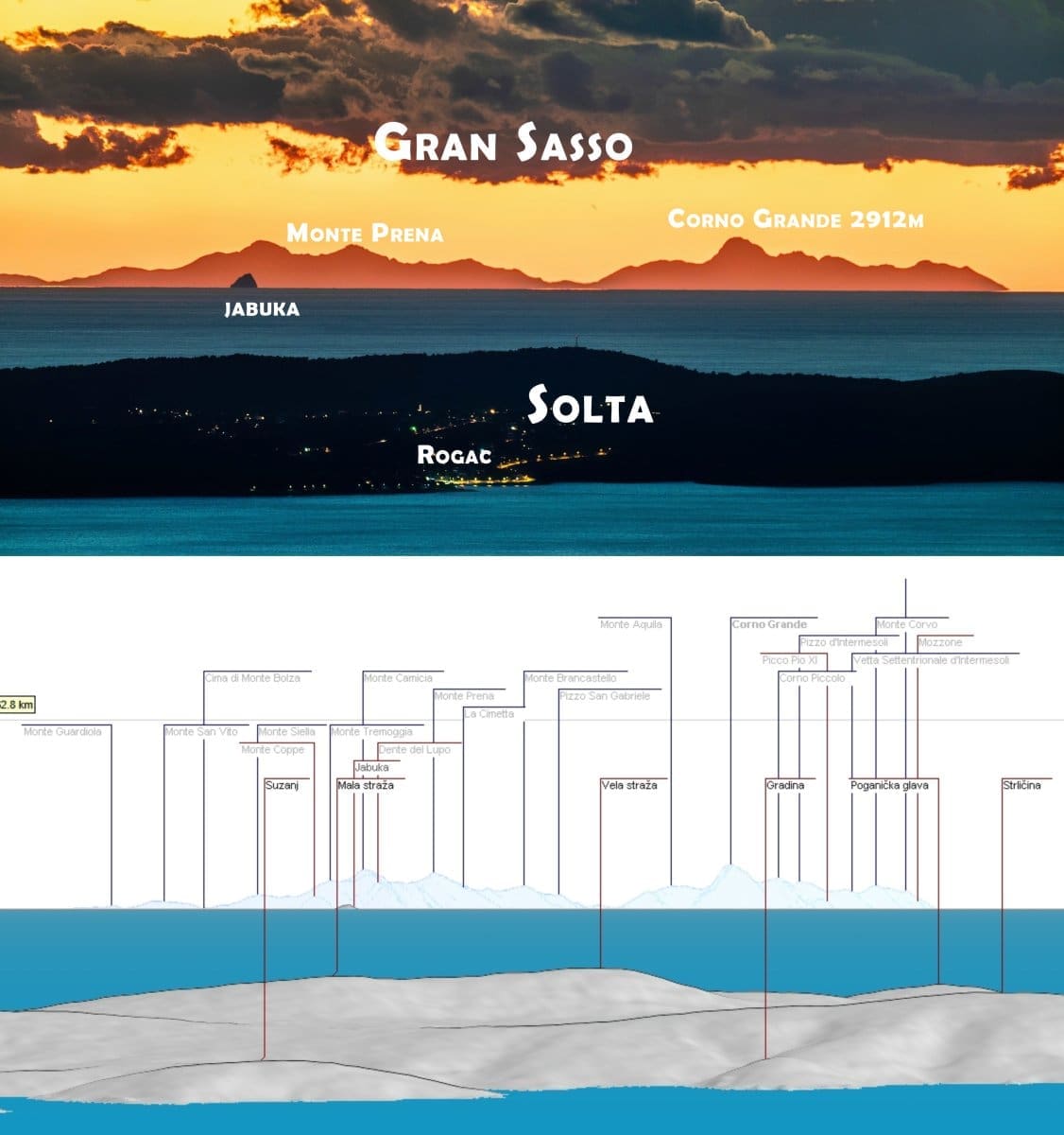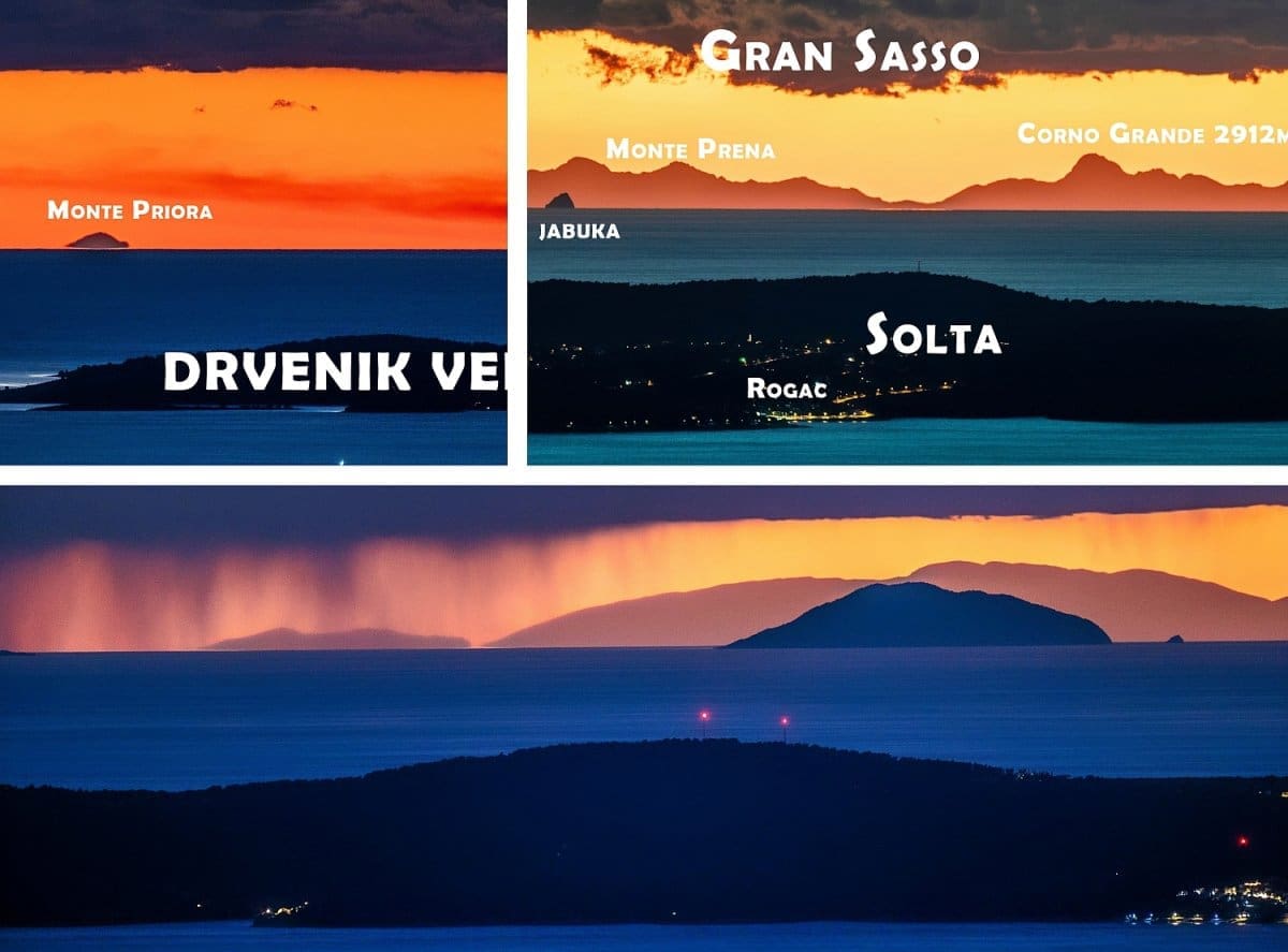 Po sredini horizonta je glavni masiv Apenina, Gran Sasso, s najvišim vrhom Corno Grandeom (2912 m). Ispred se vidi Šolta, hrid Jabuka se "zabada" u masiv talijanskog diva. Dalje, iza zapadnog dijela Šolte vidi se Monte Gorzano, a još zapadnije, iza otočića Mačaknara, izvire 2476 metara visok Monte Vettore.