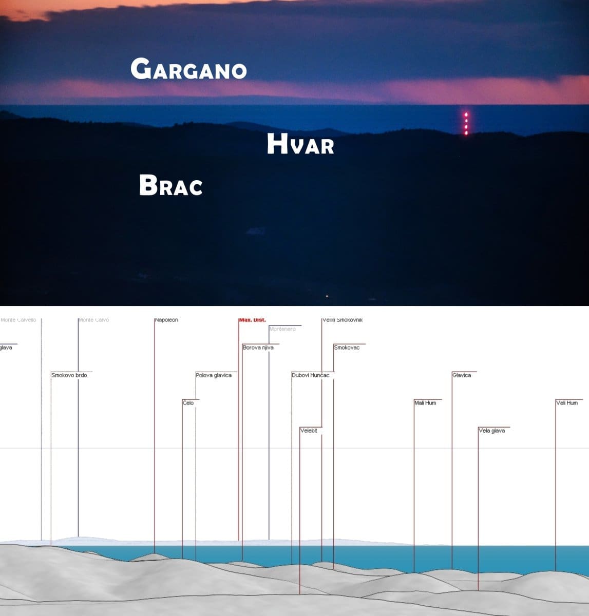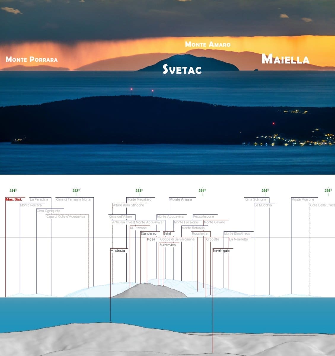 Sa Zvjezdanog sela Mosor, na 700 metara nadmorske visine, obično se vide predjeli iznad 2000 ili više metara, ali danas su uvjeti bili takvi da se vidio čak i Gargano, a njegova najviša planina je Monte Calvo s 1333 metra iznad mora, vrlo slično kao Mosor. To je najistočnija točka Apenina koja se sa spomenute točke može vidjeti, prema zapadu vidi se drugi najviše masiv Apenina, Majella s najvišim vrhom Monte Amereom. Točno ispred ovog masiva vidi se naš otok Sveti Andrija.