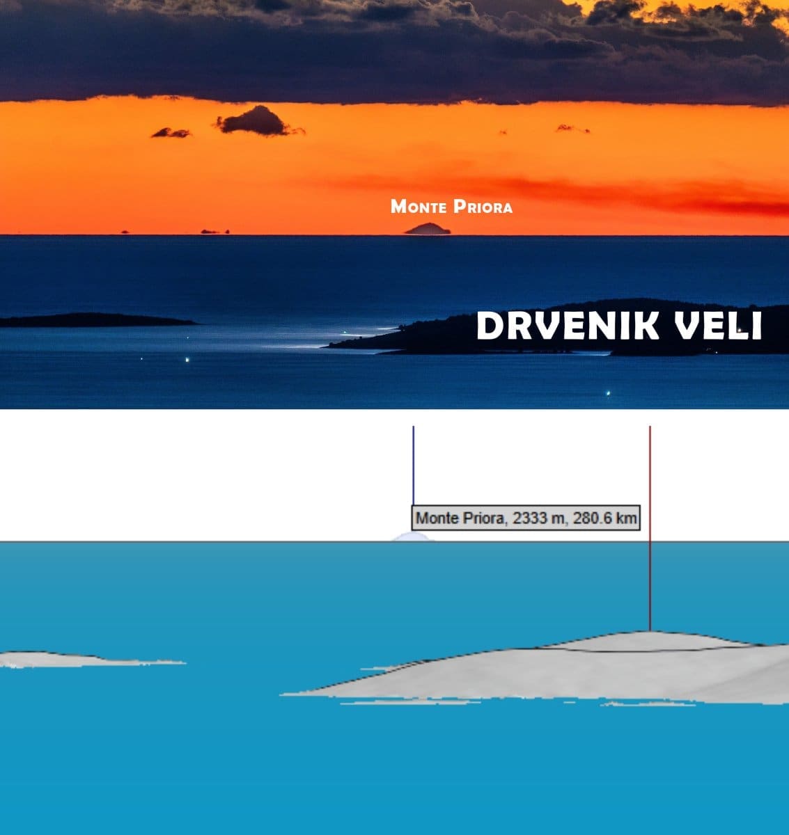 Zadnja točka talijanskog kopna prema zapadu koja se vidi s mosorske zvjezdarnice je 2333 metara visoka i 281 km udaljena Monte Priora.