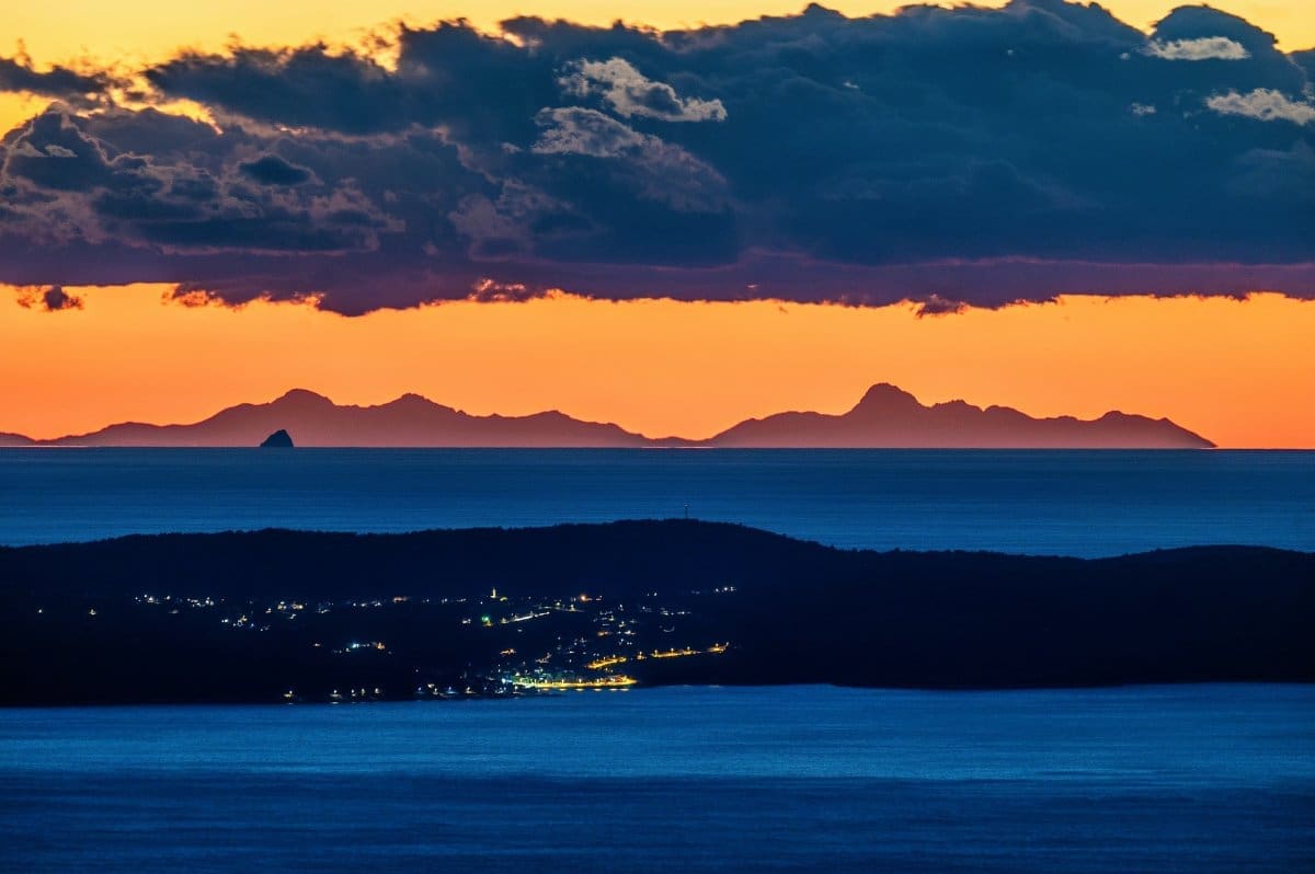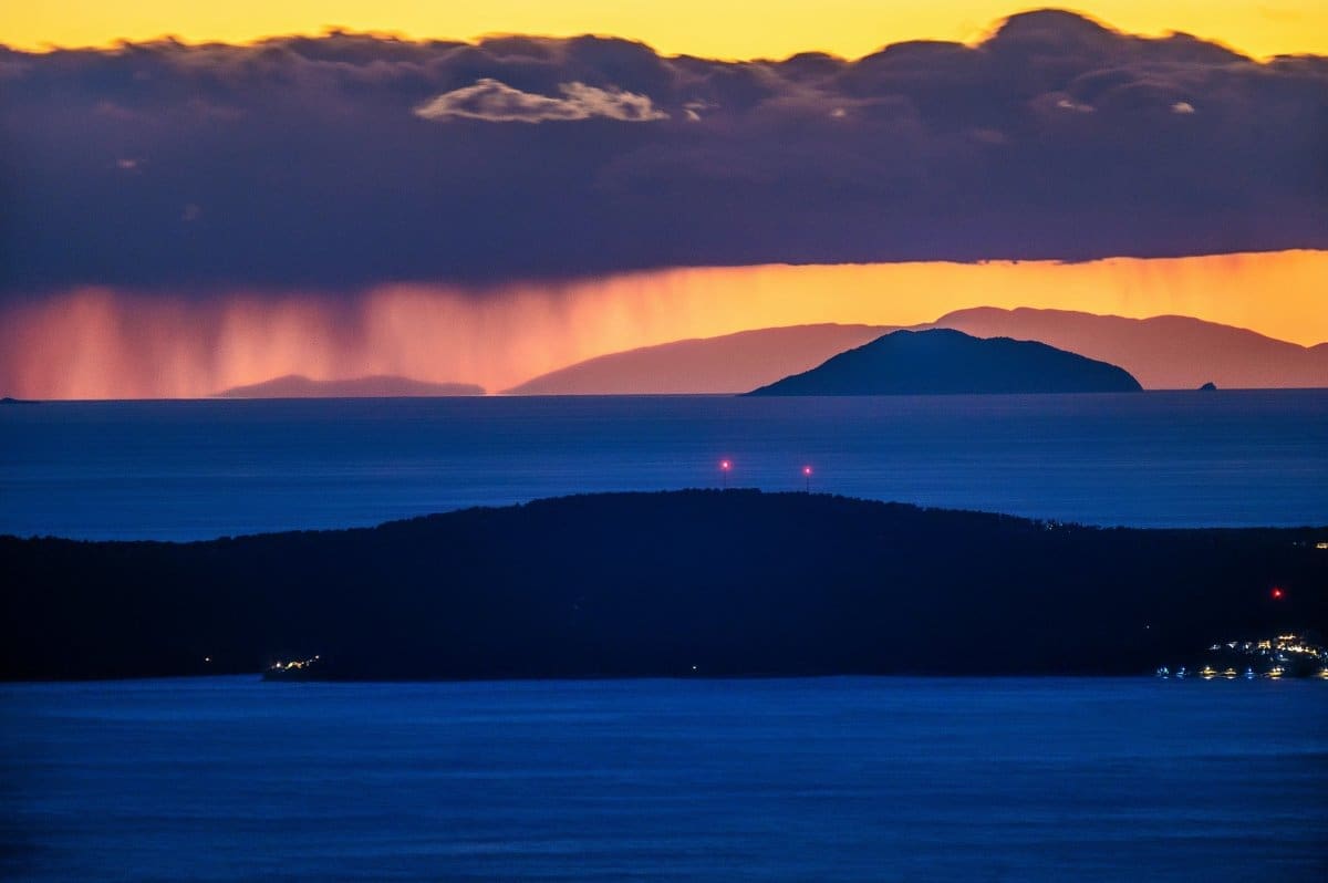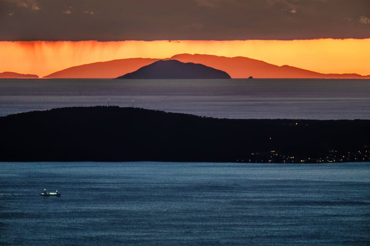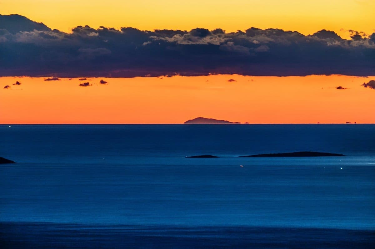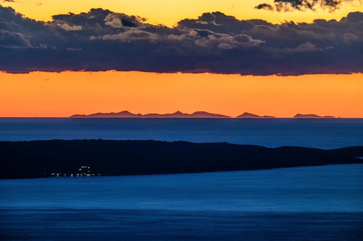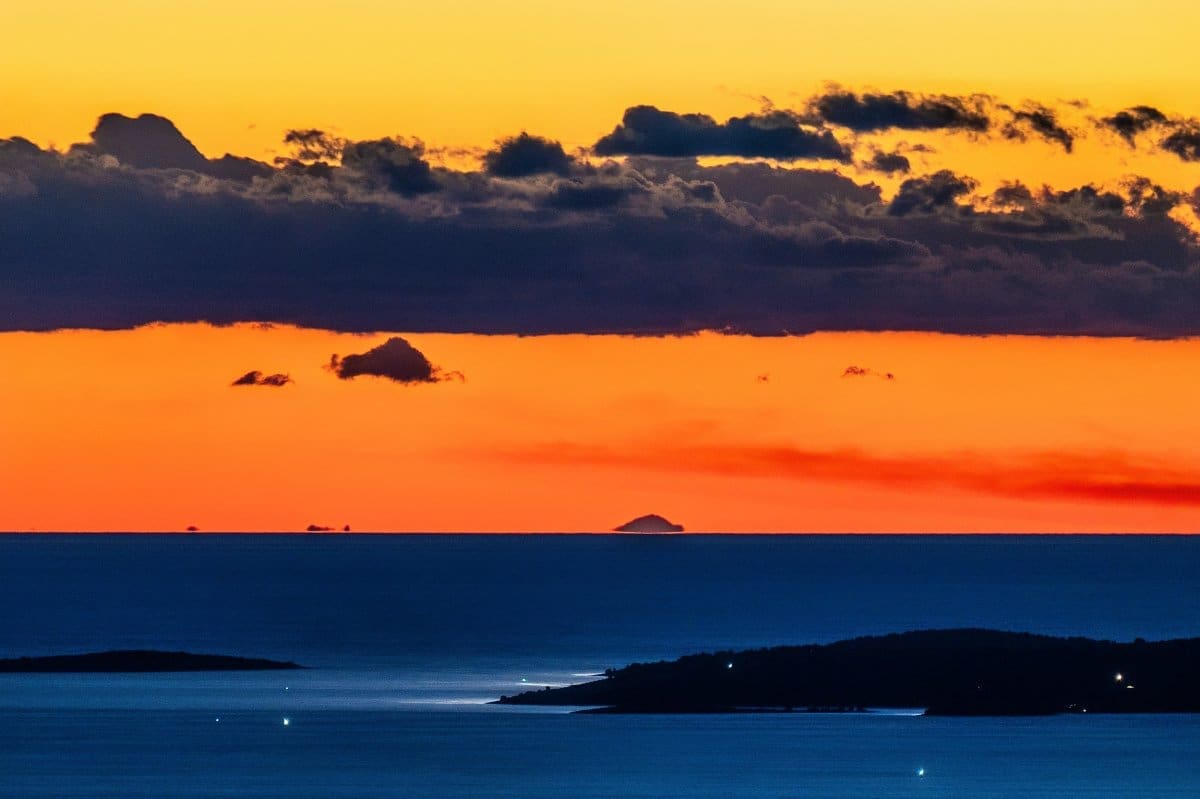 Bura je tijekom srijede uzrokovala savršenu vidljivost, a u suton se s obalnih planina i otoka na horizontu savršeno vidjela Italija, tj. Apenini.