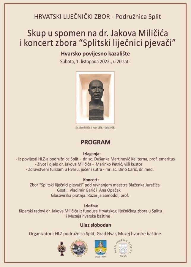 Hrvatski liječnički zbor - Podružnica Split organizira "Skup u spomen na dr. Jakova Miličića i koncert zbora 'Splitski liječnici pjevači'".