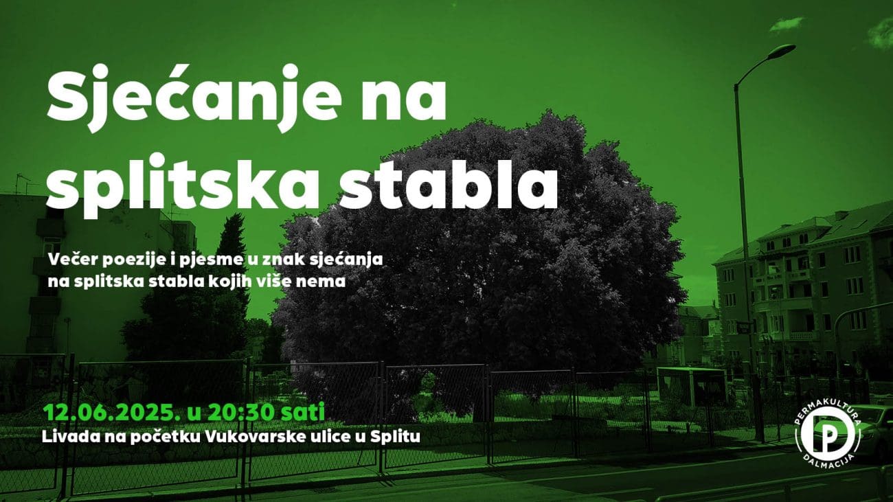 Zato vas pozivamo da se svečano i dostojanstveno okupimo kako bismo pjesmom, poezijom i zajedništvom poručili da nismo zaboravili. Da sjećanje na ta stabla i dalje živi u nama, te da želimo očuvati ono što je još ostalo — stabla koja Splitu daje dušu.