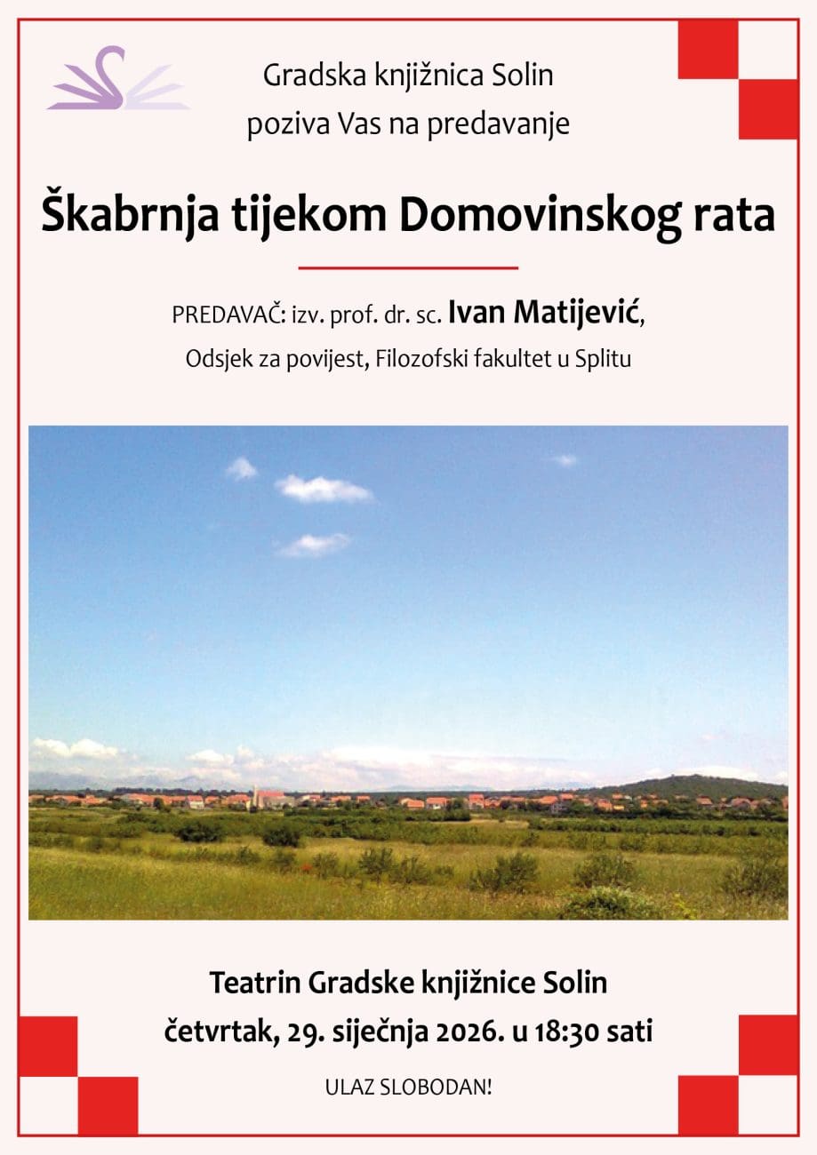 Gradska knjižnica Solin poziva na predavanje "Škabrnja tijekom Domovinskog rata" kojeg će u četvrtak, 29. siječnja s početkom u 18:30 sati u Teatrinu GK Solin održati izv.prof.dr.sc. Ivan Matijević, Odsjek za povijest, Filozofski fakultet u Splitu.