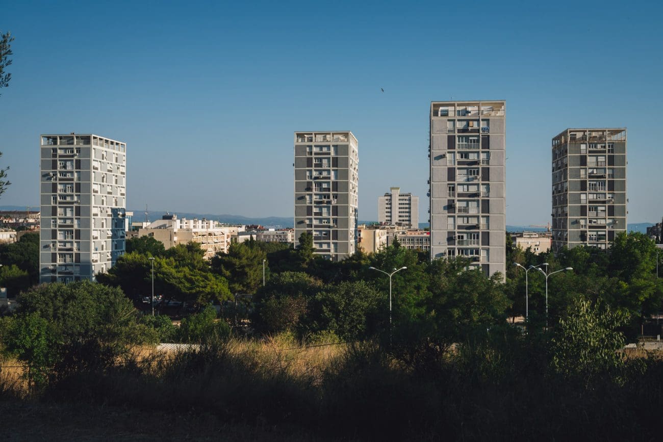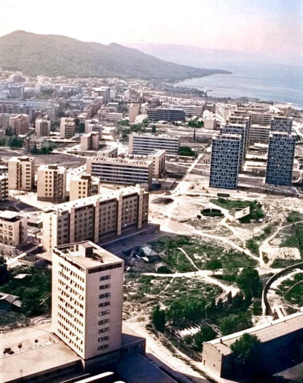 Nastavlja da je najveći stambeni sklop šest identičnih tornjeva visine 13 nadzemnih katova naizmjenično postavljenih u obliku vrhova dvaju susjednih slova V i R. U svakom tom neboderu su se nalazila identična 52 dvosobna stana raspoređena četiri po etaži, a u prizemlju jednog od njih je izgrađen dječji vrtić.