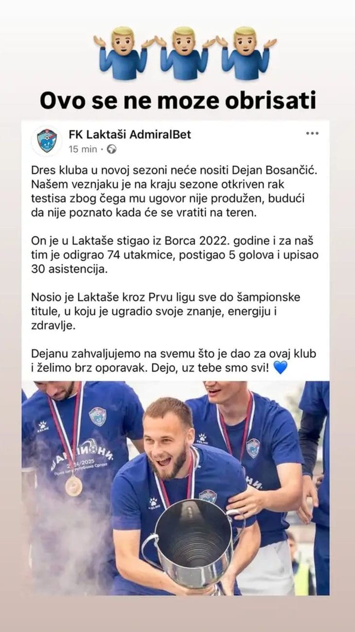 Nogometni klub Laktaši, član Prve lige Republike Srpske, izazvao je snažne osude nakon što nije produžio ugovor s Dejanom Bosančićem, 27-godišnjim veznim igračem kojem je nedavno otkriven rak testisa. Klub iz blizine Banje Luke javnost je o prekidu suradnje s Bosančićem obavijestio putem društvenih mreža, uz poruku da "zbog neizvjesnosti oko povratka na teren, ugovor nije produžen".