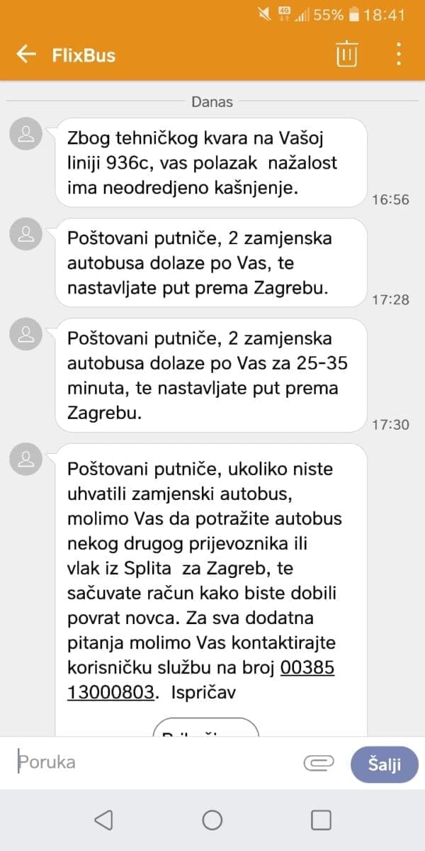 - Autobus je zastao u Trogiru pokupiti putnike, ali kad je ušao na trogirski kolodvor, pokvario se. Rečeno nam je da će kroz sat ili dva doći dva autobusa, jer ima 77 putnika - kaže naš suradnik potkrijepljujući tvrdnju SMS-om dotične tvrtke.