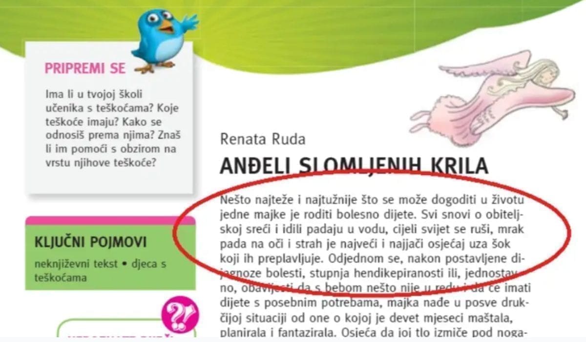 – Nešto najteže i najtužnije što se može dogoditi u životu jedne majke je roditi bolesno dijete. Svi snovi o obiteljskoj sreći i idili tada padaju u vodu, cijeli svijet se ruši, mrak pada na oči i strah je najveći najjači osjećaj uza šok koji ih preplavljuje, prva je rečenica u tekstu čitanke hrvatskog jezika za šesti razred osnovne škole, piše Srednja.hr.