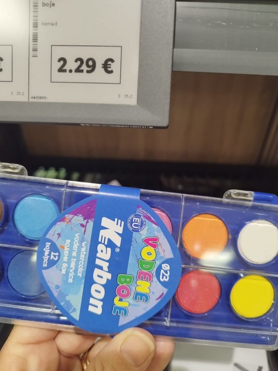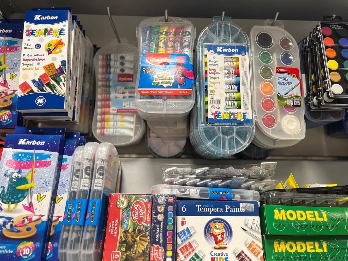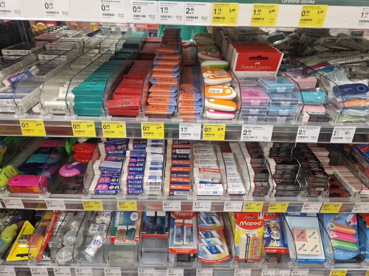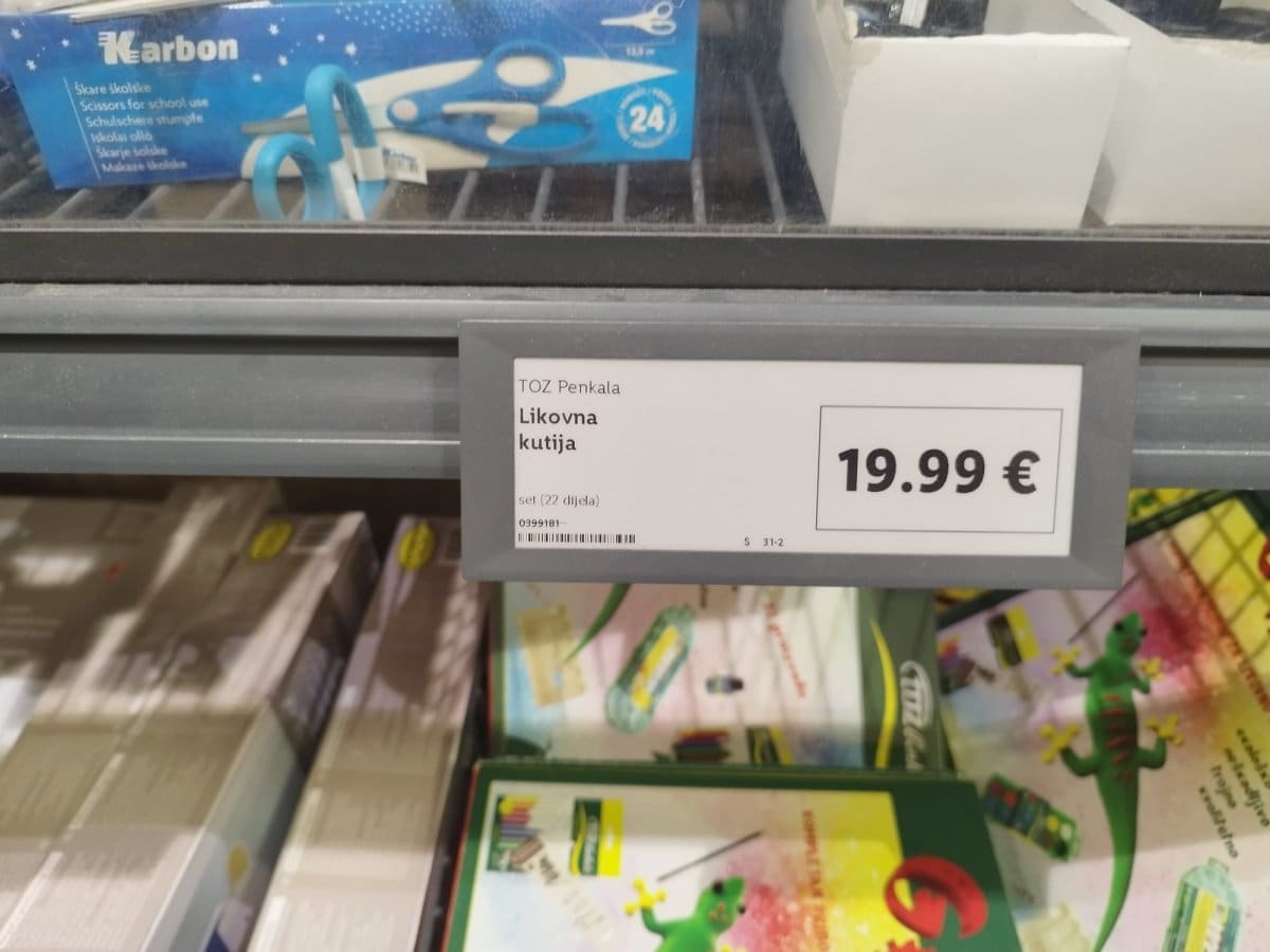 Cijene tempera su od 6,99 do 13,99 eura, vodenih bojica od 2,30 do 17,99 eura, pastele od 2,91 do 10 eura, glinamol od 2,39 eura, trokuti od 2,40 eura, šestar 10, 59 eura,…