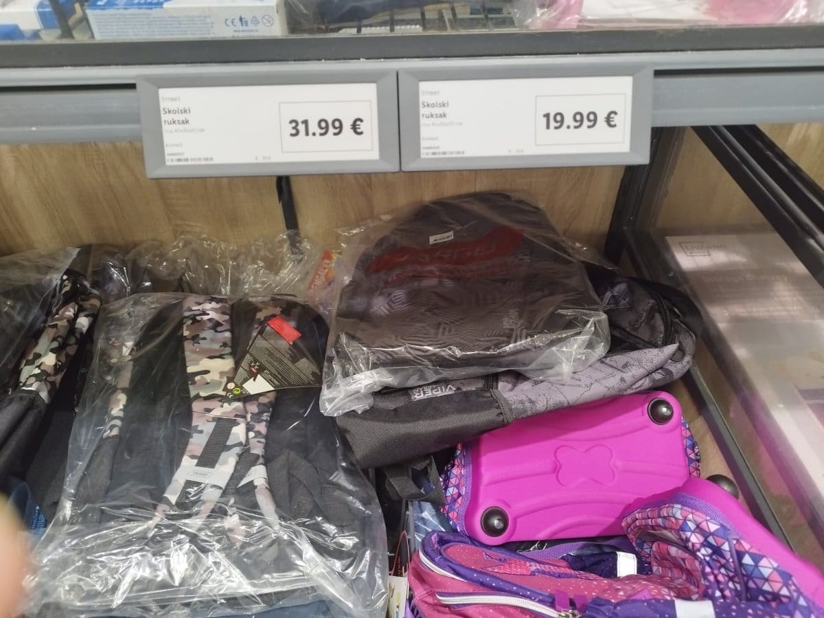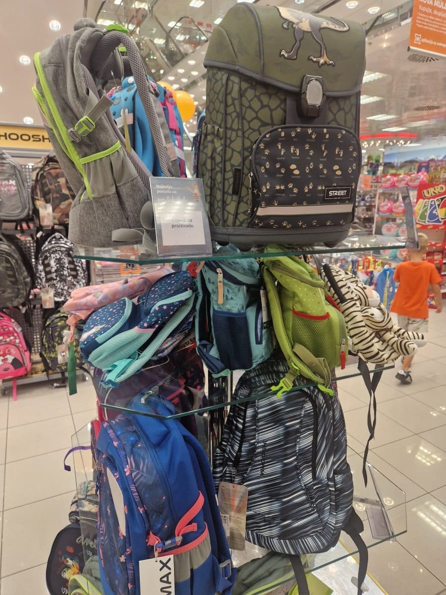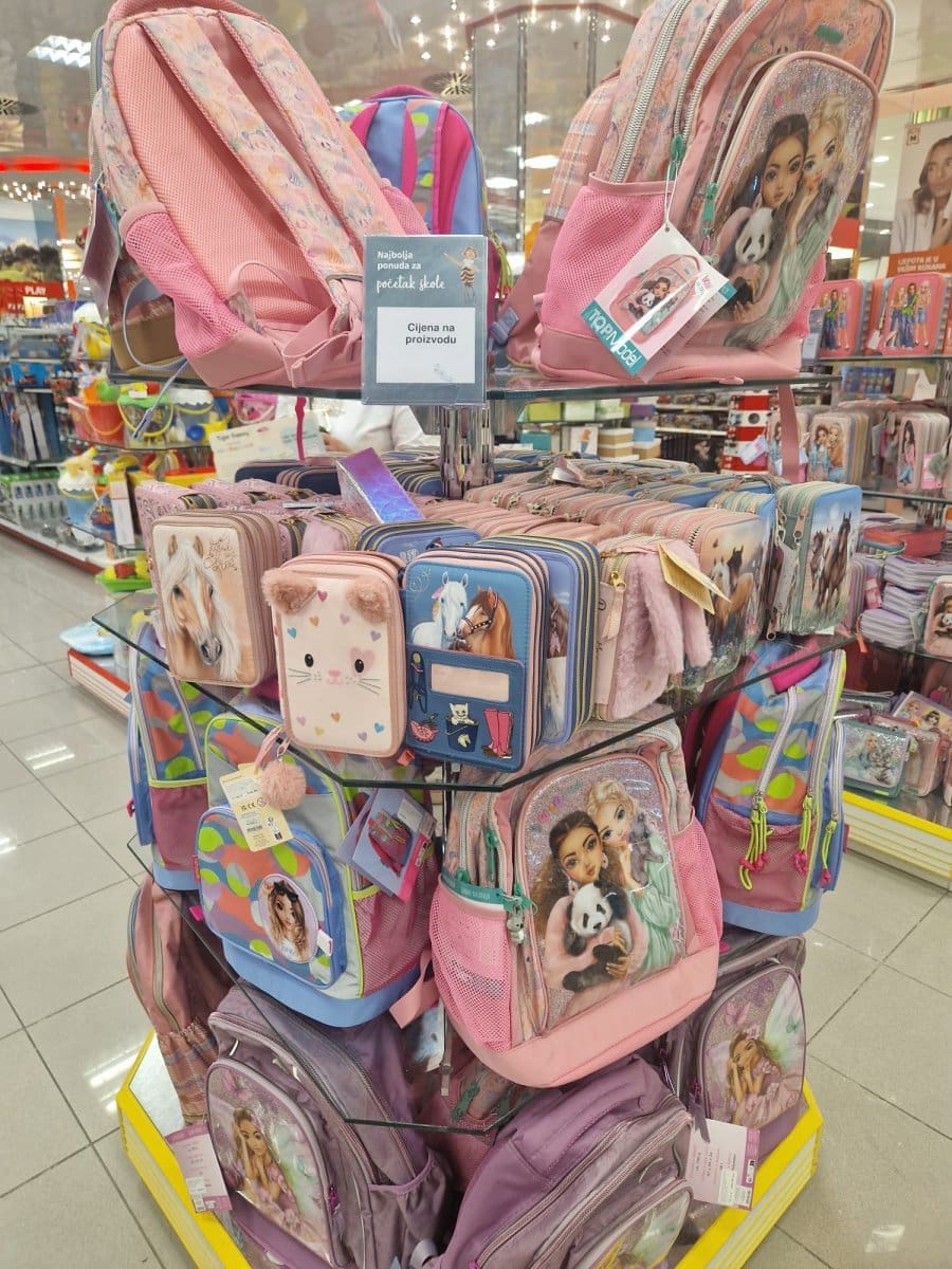 Torbe za prvašiće kreću se od 45 eura, do one najskuplje ode 320 eura (uz nju dolazi puna pernica i torba za tenisice, anatomski je jako dobro postavljena kako nam objašnjava gospođa u knjižari i to je torba koja nema rok trajanja).