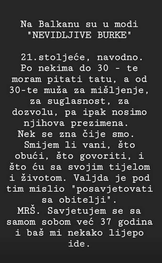 Među brojnim poznatim damama koje su odlučile da Škorinu izjavu neće prešutjeti, našla se i splitska glumica Ana Gruica. Na svom Instagram profilu objavila je poduži status u kojem je poručila da se 37 godina savjetuje sama sa sobom. "21. stoljeće, navodno. Po nekima do 30-te moram pitati tatu, a od 30-te muža za mišljenje, za suglasnost, za dozvolu, pa ipak nosimo njihova prezimena. Nek se zna čije smo. Smijem li vani, što obući, što govoriti, i što ću sa svojim tijelom i životom. Valjda je pod tim mislio 'posavjetovati sa obitelji'. Mrš. Savjetujem se sama sa sobom 37 godina i baš mi nekako lijepo ide", napisala je Gruica.