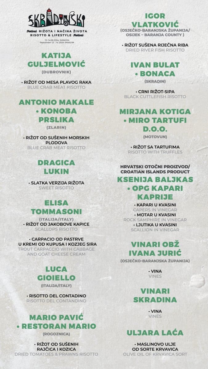 Nakon petka, kuhinja će u subotu od 17 sati biti na Trgu Male Gospe u Skradinu. Vrsni kuhari iz Hrvatske i Italije svojim će kulinarskim umijećem i kreativnošću, pripremati razne kombinacije rižota, od tradicionalnih receptura i čuvenog skradinskog rižota do modernih varijacija. Chefovi u čijim ćete jelima imati priliku uživati na RIŽOT Cooking show su: Katija Guljelmović (Dubrovnik; rižot od mesa plavog raka), Antonio Makale (Konoba Prslika, Zlarin; rižot od sušenih morskih plodova), Dragica Lukin (Istra; slatka verzija rižota), Elisa Tommasoni (Italija; rižot od jakobove kapice, carpacio od pastrve u kremi od kupusa i kozjeg sira), Luca Gioiello (Italija; Risotto del contadino), Mario Pavić (Konoba Mario, Rogoznica; rižot od sušenih rajčica i kozica), Igor Vlatković (Osječko – baranjska županija; rižot sušena riječna riba), Ivan Bulat (Bonaca Skradin; crni rižot – sipa), Ante Pižić (Arka Skradin; skradinski rižot), Mirjana Kotiga (Miro tartufi d.o.o. Motovun; rižot s tartufima) te Hrvatski otočni proizvod – Ksenija Baljkas (OPG Kapari Kaprije; kapari u kvasini, motar u kvasini, ljutika u kvasini).