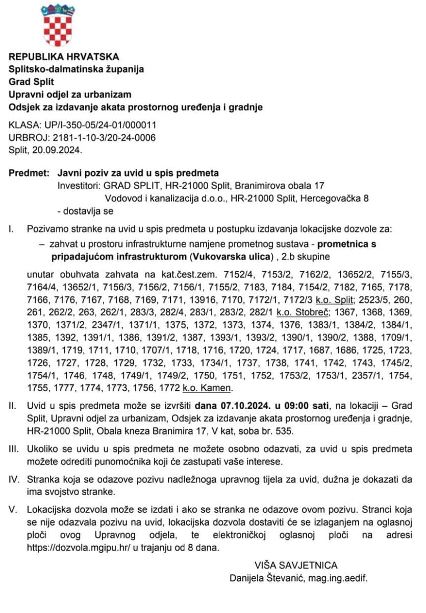 "U 9 sati zakazan je javni uvid za stranke u postupku izdavanja lokacijske dozvole za nastavak Vukovarske ulice, ali vlasnici parcela uopće nisu dobili poziv. Takvih vlasnika je više od sto", izjavila je Kovačević, dodavši kako je poziv bio objavljen isključivo na portalu e-dozvole, a potom uklonjen. "Očito se nešto skriva od vlasnika parcela", tvrdi ona, naglašavajući kako vlasnici već desetljećima čekaju na nastavak izgradnje ulice, koja je ključna prometna arterija Splita.