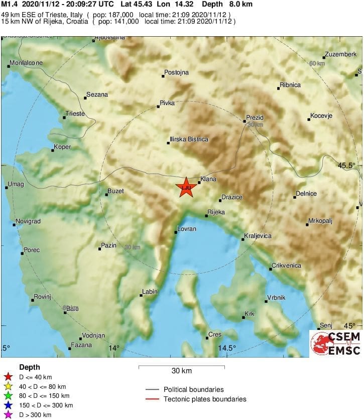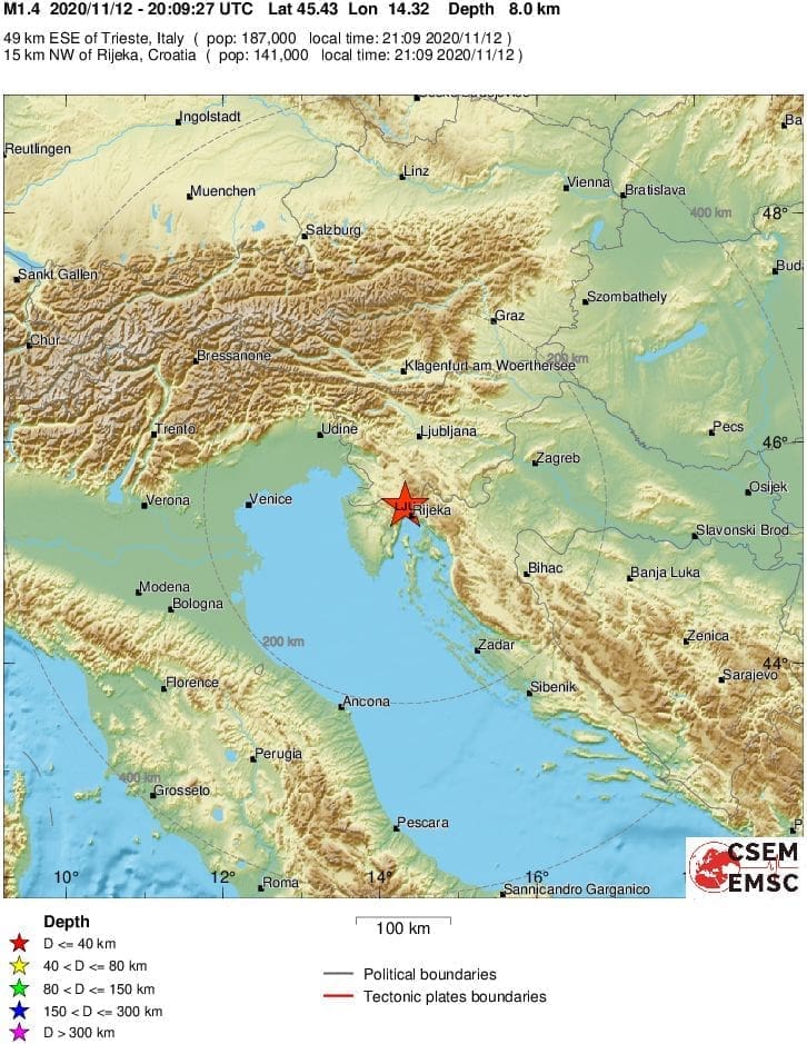 Prema podacima EMSC-a, u 21 sati i 9 minuta dogodio se potres magnitude 1.4 po Richteru, a epicentar mu je bio 15 kilometara sjeverozapadno od Rijeke.