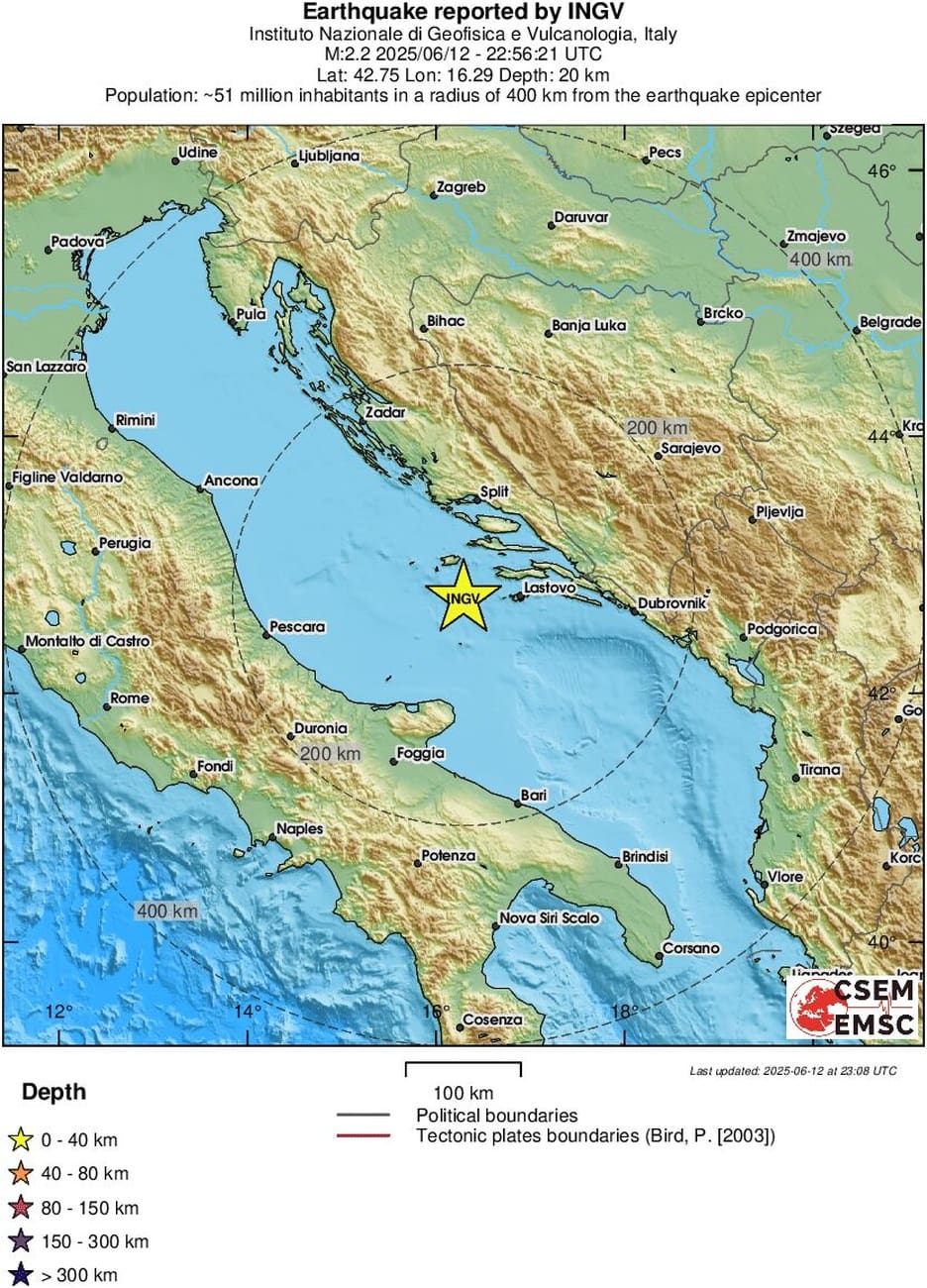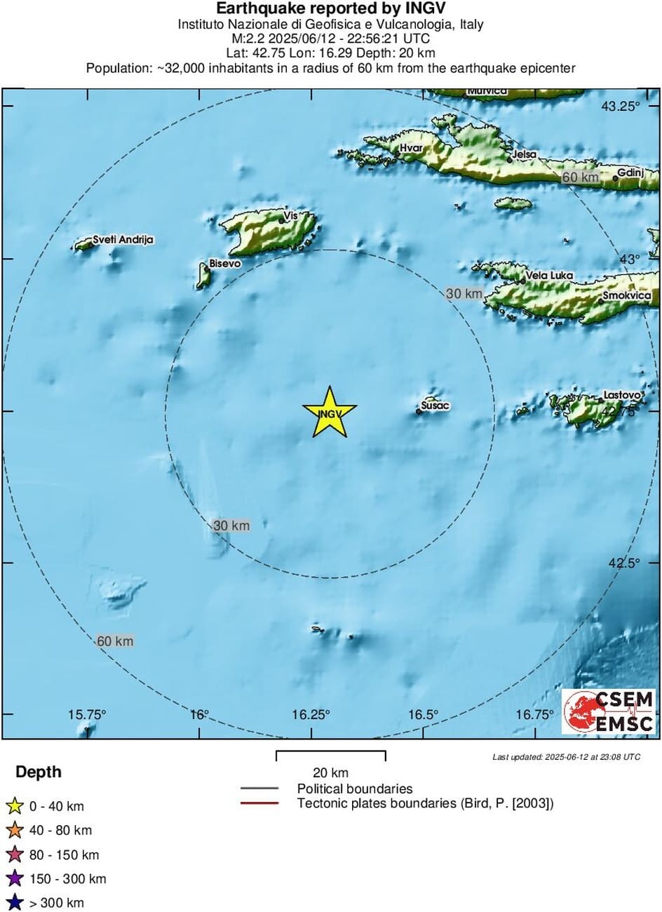 Prema podacima Europsko-mediteranskog seizmološkog centra, u ponoć i 56 minuta zabilježen je slab potres na području srednjeg Jadrana.