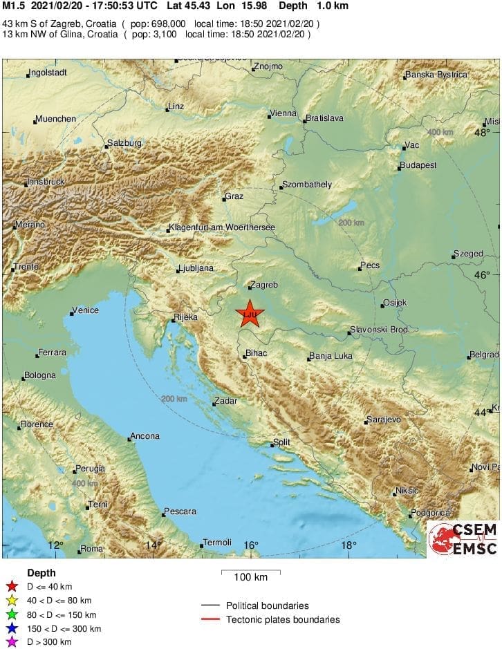 U 18 sati u 50 minuta dogodio se slab potres s epicentrom 13 kilometara sjeverozapadno od Gline. Magnituda mu je bila 1.5 prema Richteru, a dubina 1 kilometara.