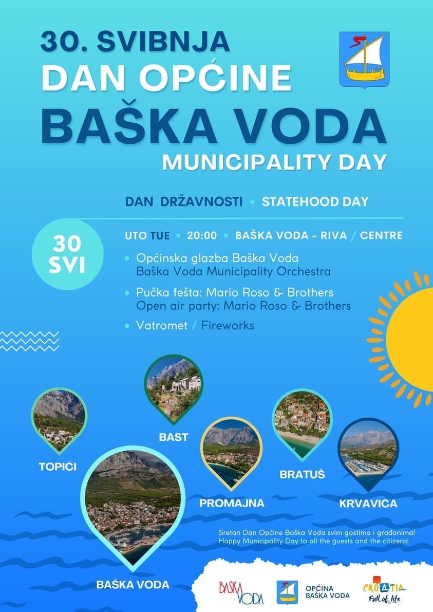 Danas, 30.svibnja Baška Voda slavi svoj Dan općine, koji pada i na hrvatski Državnosti. Tom prilikom organiziran je i prigodni program u kojem će moći uživati svi posjetitelji.