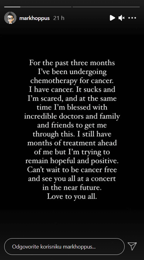 "Ispred mene su još mjeseci liječenja, no borit ću se koliko mogu i ostat ću pozitivan. Jedva čekam pobijediti ovu bolest i da se uskoro ponovno vidimo na koncertima. Volim vas sve", dodao je, prenosi Index.