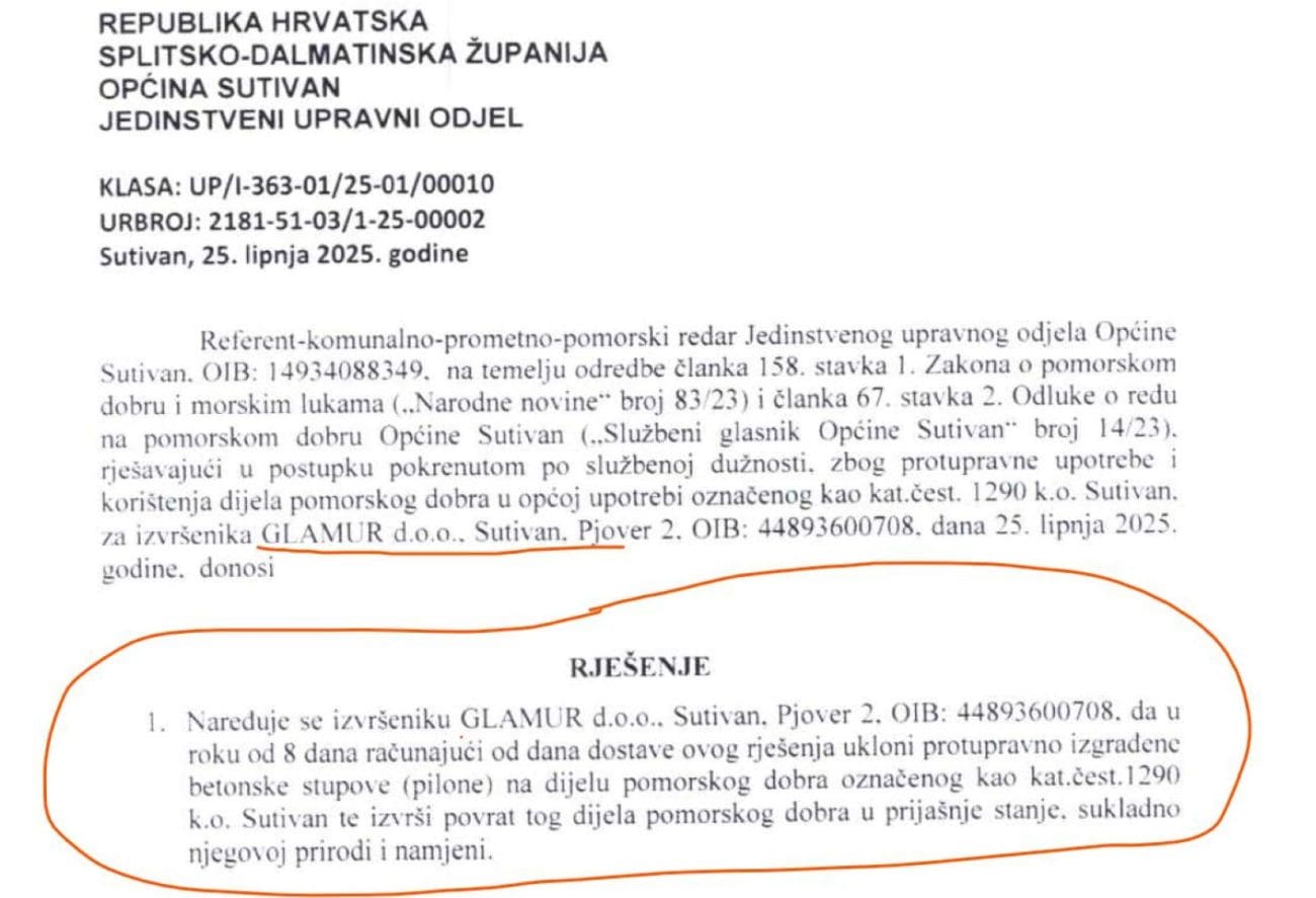 Na plaži Tatinje u Sutivanu, gdje se nalazi i popularna plaža za pse, uklonjeni su betonski stupovi i nasip nakon što je Općina Sutivan donijela rješenje kojim se tvrtki Glamur d.o.o. naređuje da u roku od osam dana ukloni nezakonito izgrađene objekte. Rješenje komunalnog redarstva temelji se na Zakonu o pomorskom dobru, a odnosi se na česticu k.č. 1290 k.o. Sutivan, javlja inicijativa Javno je dobro.