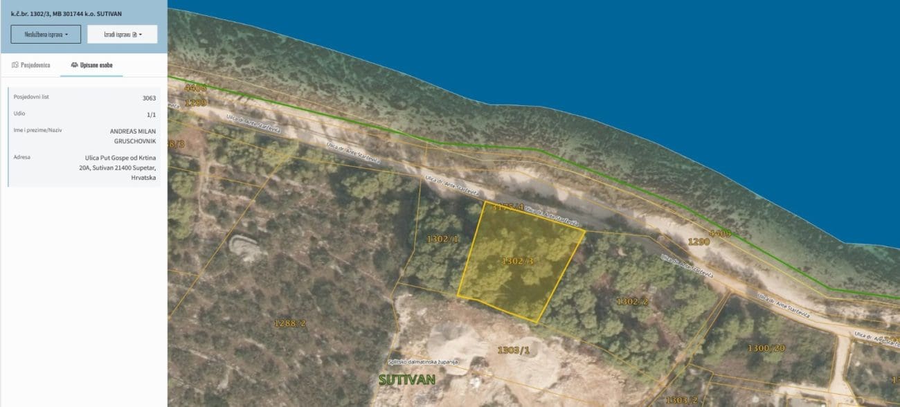 No, priča ovdje ne staje. Naime, iako su stupovi s plaže uklonjeni, radovi su se nastavili na čestici 1302/3, koja je u privatnom vlasništvu Andreasa Milana Gruschovnika, ujedno i vlasnika tvrtke Glamur d.o.o., registrirane upravo u Sutivanu. Na toj čestici se sada nalazi infrastruktura za vodu, struju, ali i – što je posebno zabrinjavajuće – crna jama, bez vidljive građevinske oznake i građevinske dozvole.