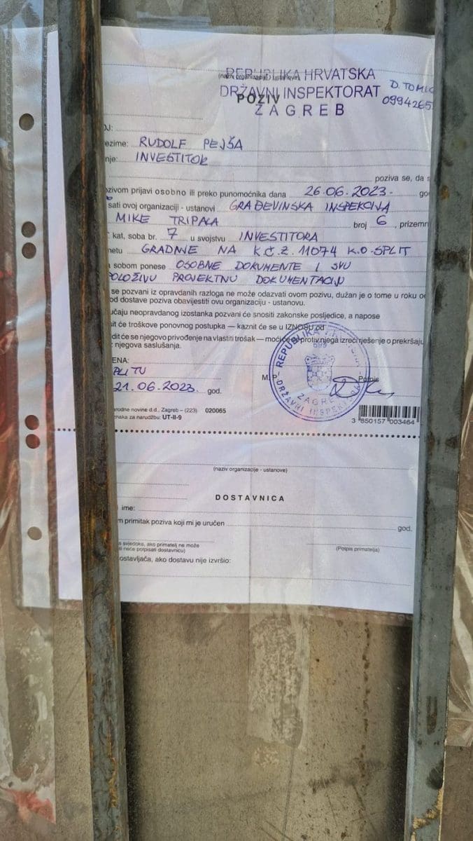 I sad šok i vjeverica! Investitor Robert Pejša dobio je poziv Državnog inspektorata, odnosmo Građevinske inspekcije, da obađe malo njihove urede na Brodarici i to 26. lipnja ove godine sve skupa sa svom raspoloživom projektnom dokumentacijom.