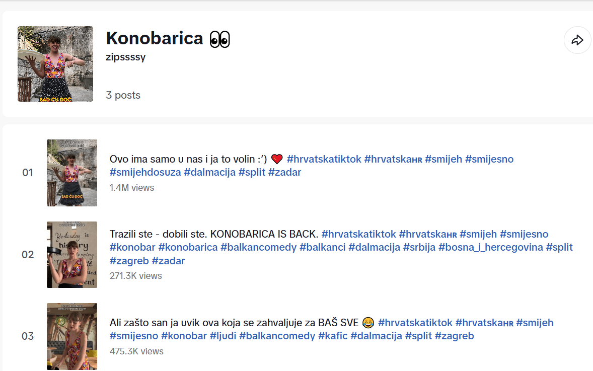 - Moji pratitelji su počeli rasti kada sam objavljivala videa na kojima nisam ja. Sjećam se da je prvi video koji mi je postao popularan nakon objave naziva 'Sviraj kolooo', a koji je snimljen na jednoj svadbi na kojoj sam pjevala. Videom sam išla opisati razliku svadbi kod stranaca i kod nas. Ima 700 000 pregleda i odmah su mi krenule rasti brojke. Pratitelji su tada lajkali i komentirati druga videa. To je bio trenutak u kojem sam si rekla 'sad je moment u kojem se moram, ako se želim bavit kreiranjem sadržaja, angažirati oko videa. Algoritam je tada učinio svoje. Zapravo sam nakon tog videa krenula snimati sebe, snimati skečeve...