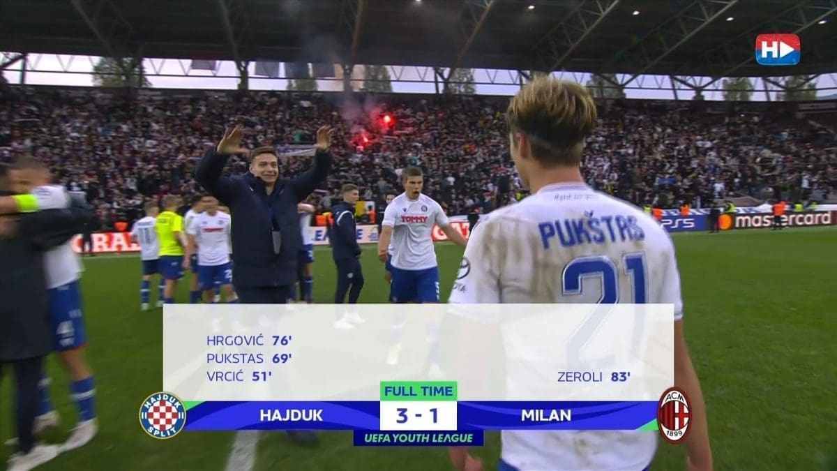Mlada momčad Hajduka plasirala se u finale Lige prvaka mladih nakon što su u polufinalnoj utakmici u Ženevi pobijedili Milan 3:1 golovima Vrcića u 51. i Pukštasa u 69. i Hrgovića u 76. minuti.