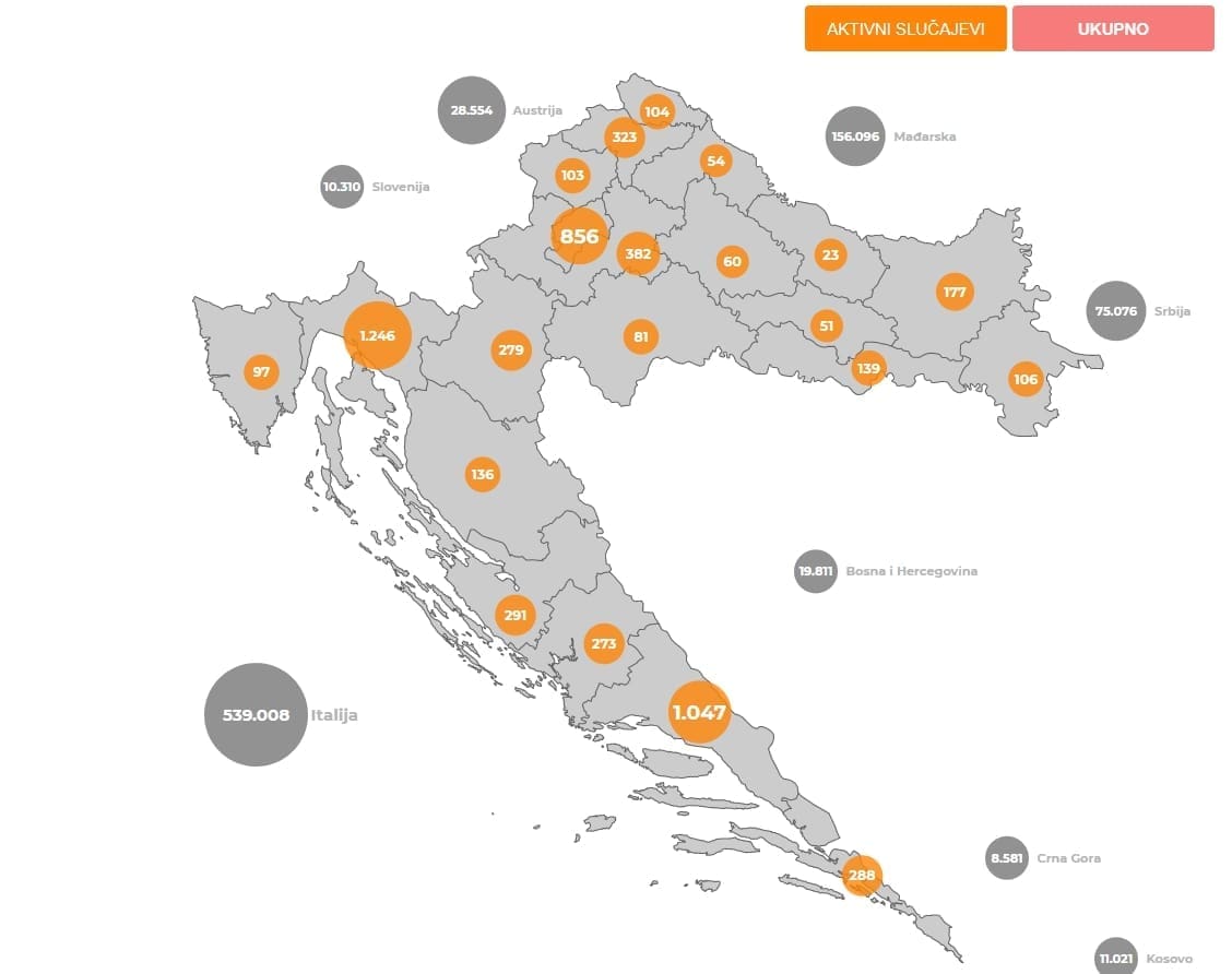 Od 25. veljače 2020., kada je zabilježen prvi slučaj zaraze u Hrvatskoj, do danas ukupno je zabilježeno 255 619 osoba zaraženih novim koronavirusom, od kojih su 5743 preminule, ukupno se oporavilo 243 450 osoba od toga 785 u posljednja 24 sata.