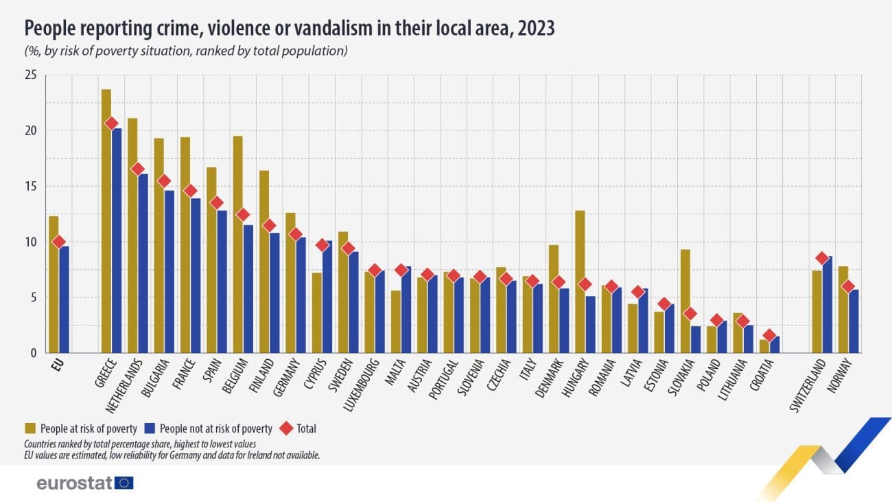 Prema podacima iz zemalja EU, među osobama u riziku od siromaštva, najviše su kriminal, nasilje ili vandalizam prijavili građani Grčke (23,7%), Nizozemske (21,1%) i Belgije (19,5%), dok su najniži postoci zabilježeni u Hrvatskoj (1,2%), Poljskoj (2,4%) i Litvi (3,6%), javlja Eurostat.