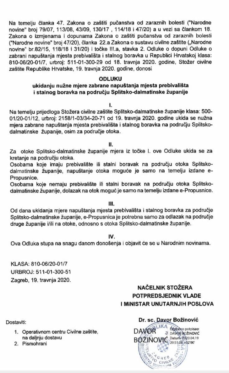 Načelnik Nacionalnog stožera civilne zaštite i ministar unutarnjih poslova, Davor Božinović, potpisao je u nedjelju odluku o ukidanju nužne mjere zabrane napuštanja mjesta prebivališta i stalnog boravka na području Splitsko-dalmatinske županije.