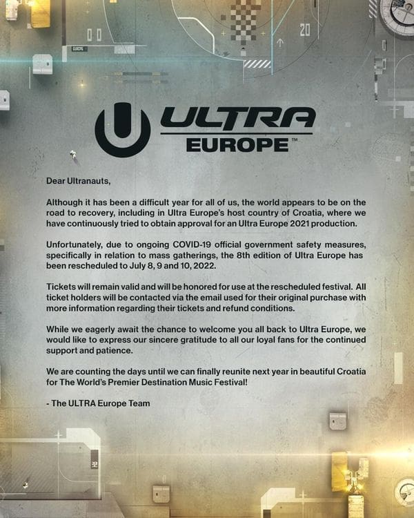 - Ulaznice će vrijediti i za novi festival. Svi vlasnici ulaznica kontaktirat će se putem e-maila za više informacija u vezi s njihovim ulaznicama i uvjetima povrata novca. Dok nestrpljivo čekamo priliku da vas ponovno pozdravimo na Ultri, željeli bismo izraziti iskrenu zahvalnost svim vjernim obožavateljima na kontinuiranoj podršci i strpljenju - poručili su između ostalog organizatori.