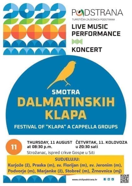 U četvrtak 11. kolovoza s početkom u 20.30 sati ispred crkve Gospe u Siti u Strožancu održava se smotra Dalmatinskih klapa.
